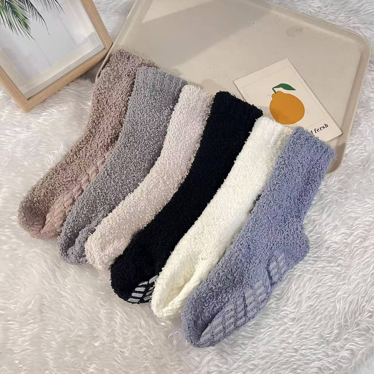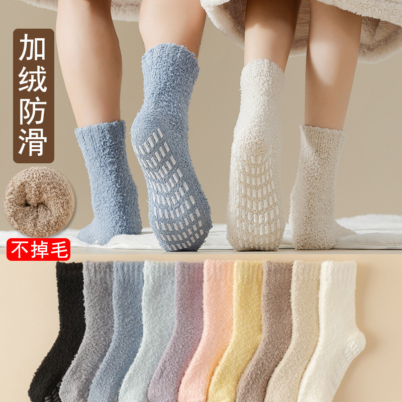 25色の女性用滑り止めソックス、グリップ付きぬいぐるみ滑り止めスリッパソックス、季節のコーラルベルベットソックス、ハーフベルベット