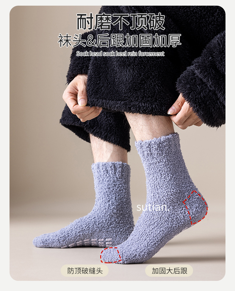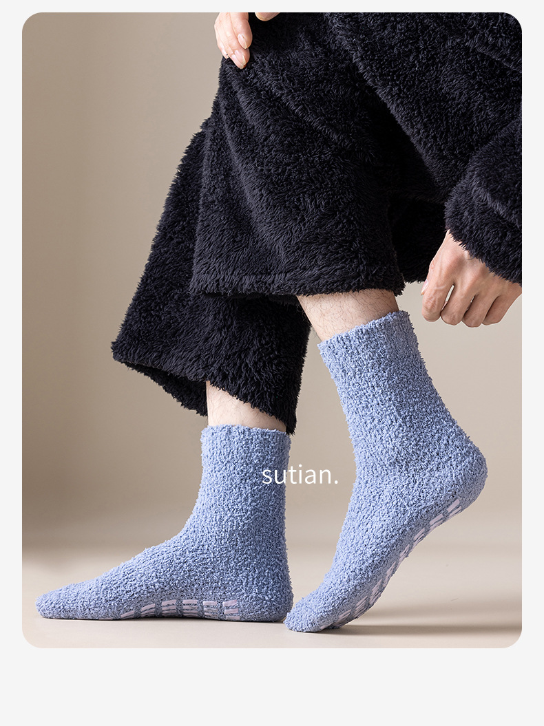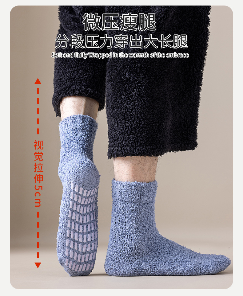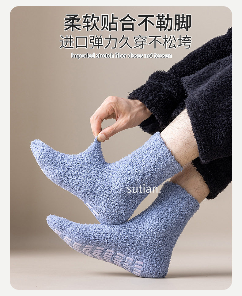 珊瑚绒袜子男中筒秋冬季保暖地板袜防滑加绒加厚毛圈睡眠袜冬天