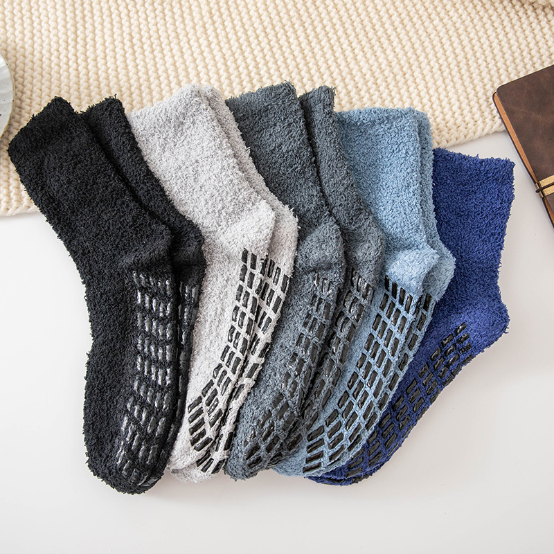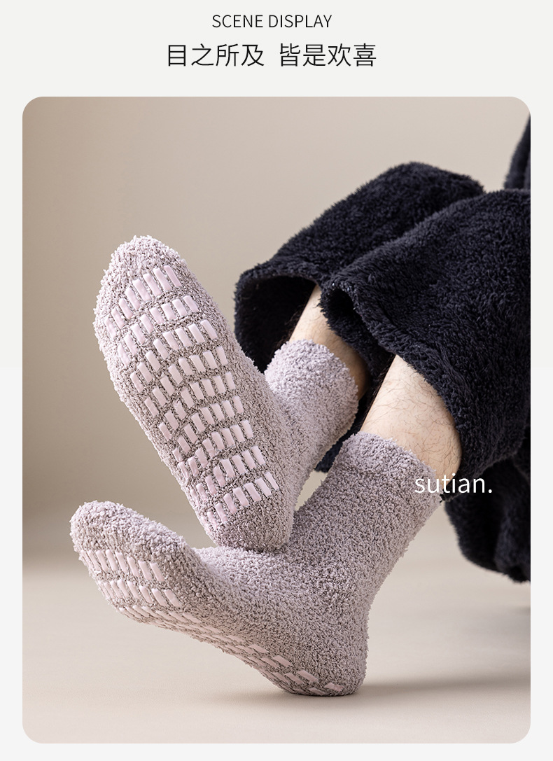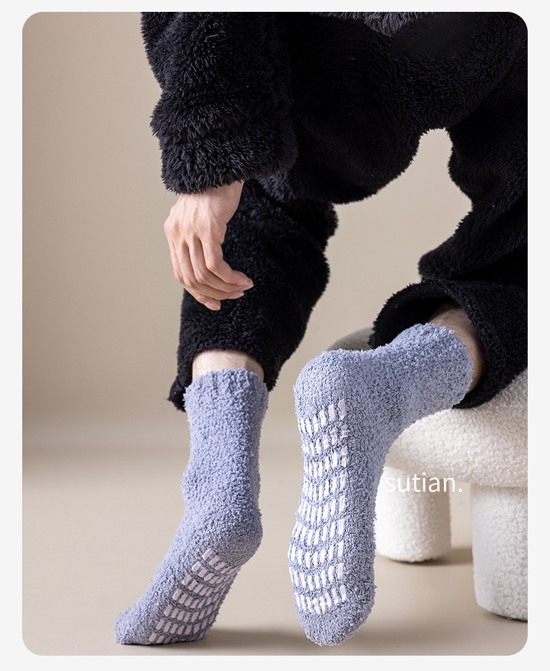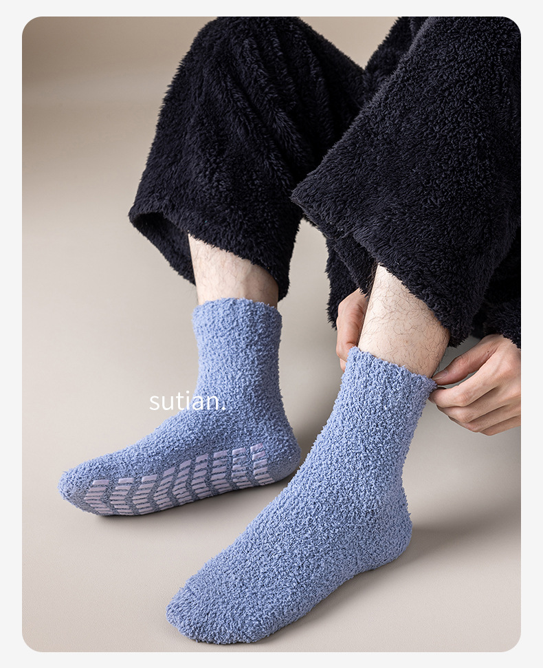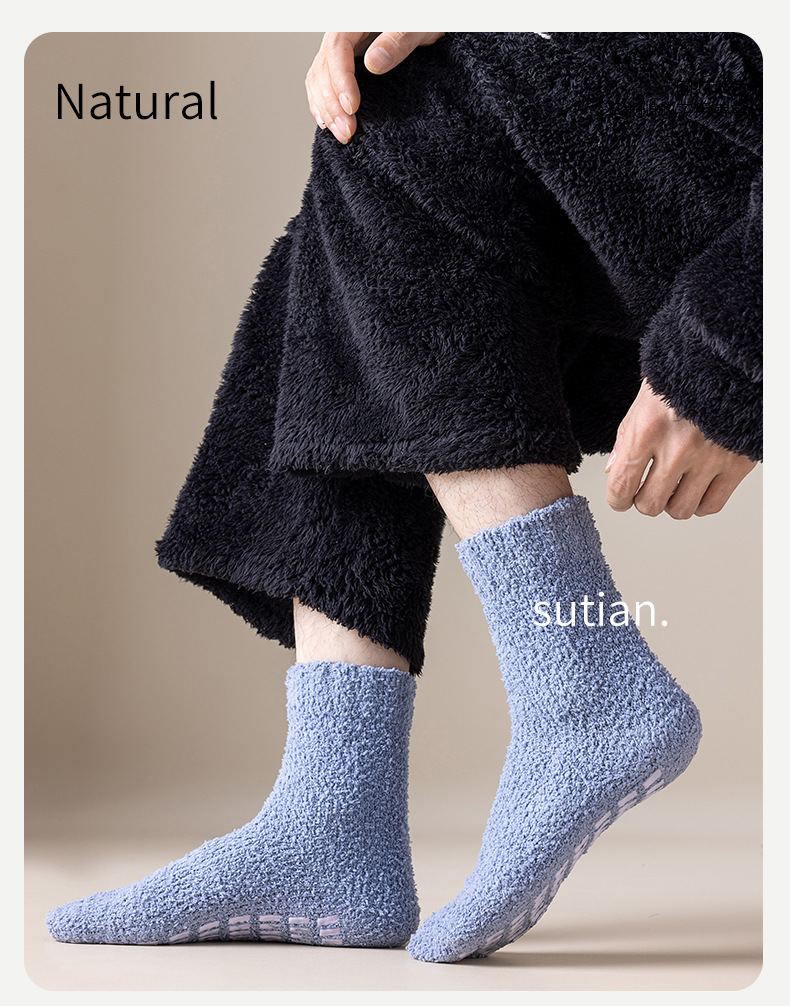 珊瑚绒袜子男中筒秋冬季保暖地板袜防滑加绒加厚毛圈睡眠袜冬天