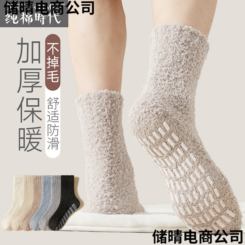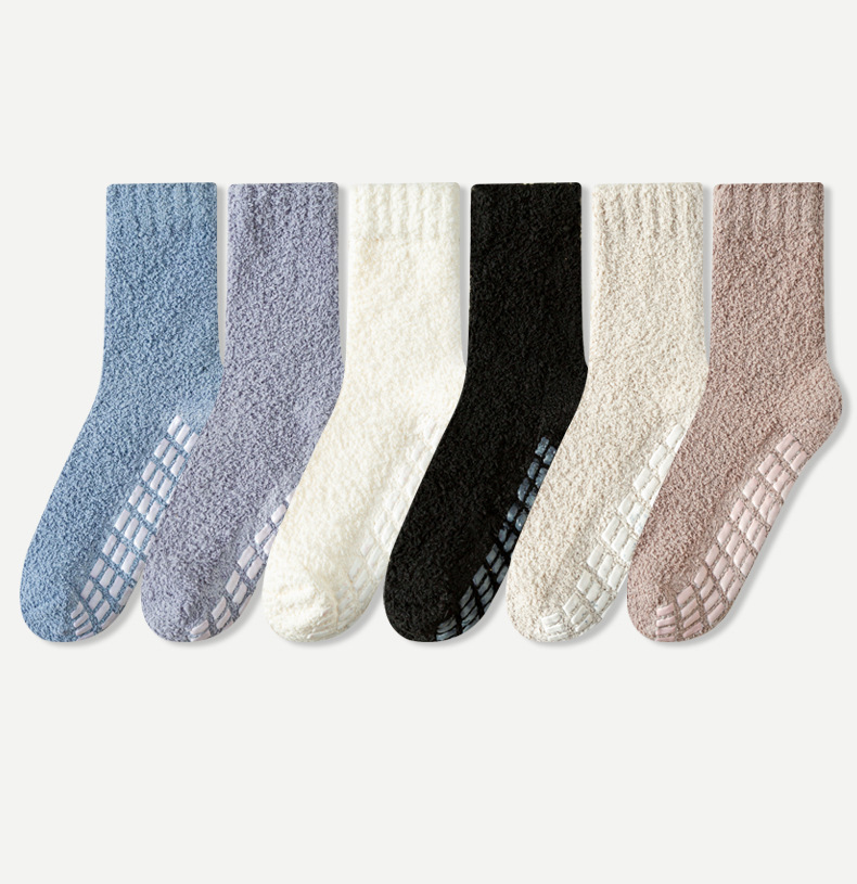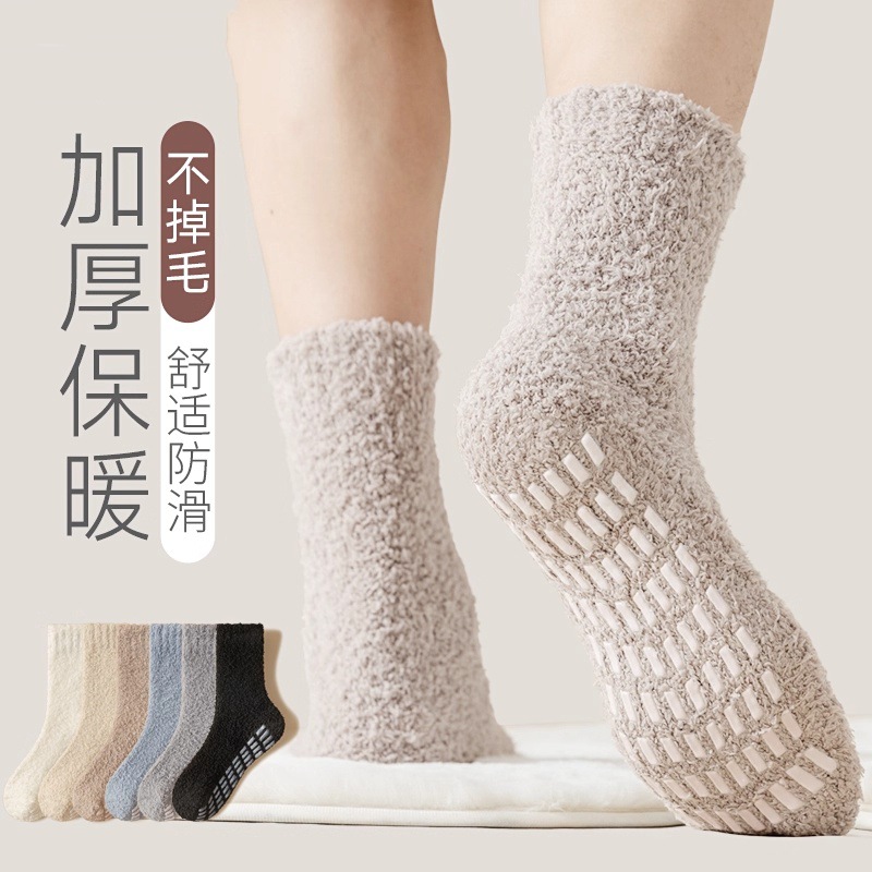 毛落ちしないコーラルベルベット靴下男女純色滑り止め点ゴム靴下秋冬保温タオル半面ベルベット床靴下国境を越えた