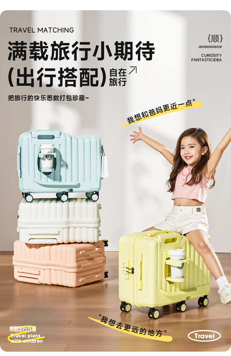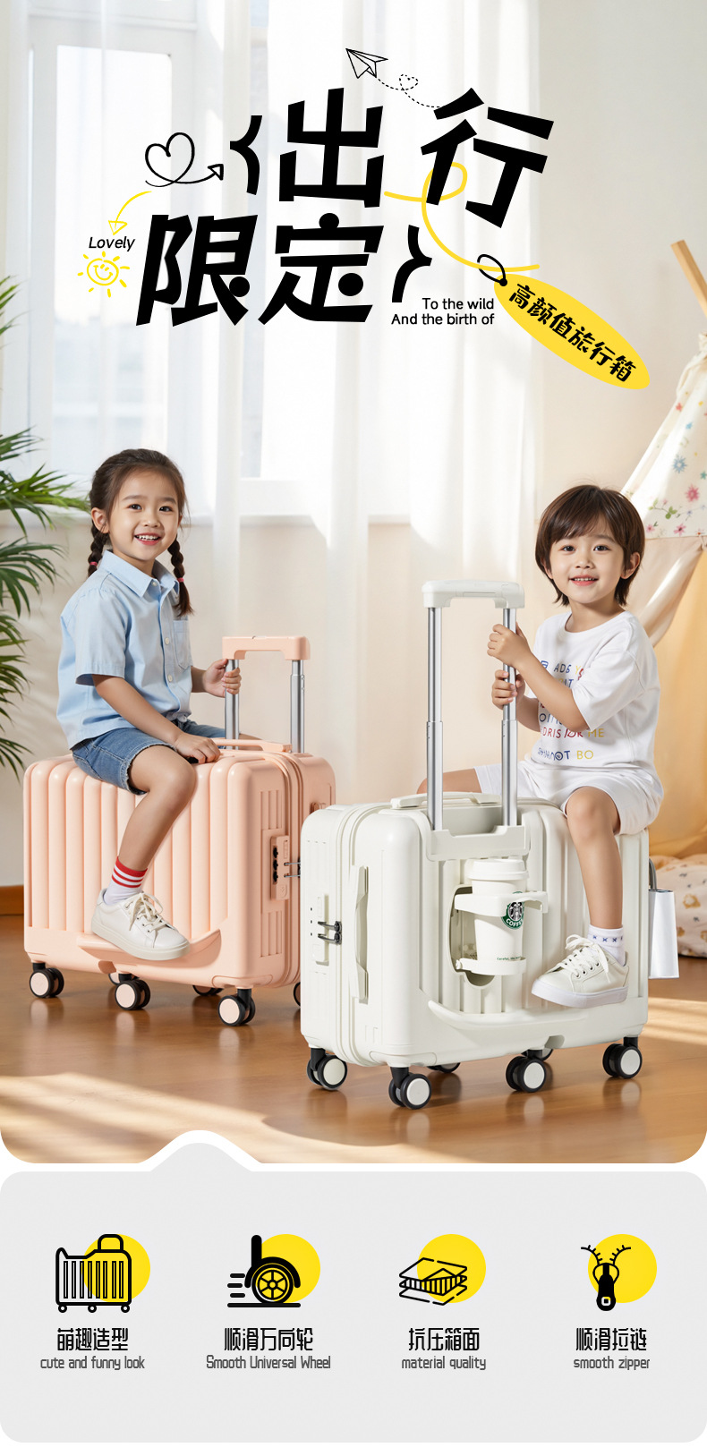 新しい子供用スーツケースは、ユニバーサルホイール付きで乗れるトロリーケースです。パスワード付きの機内持ち込み用スーツケースは、子供連れ旅行のための素晴らしいツールです。