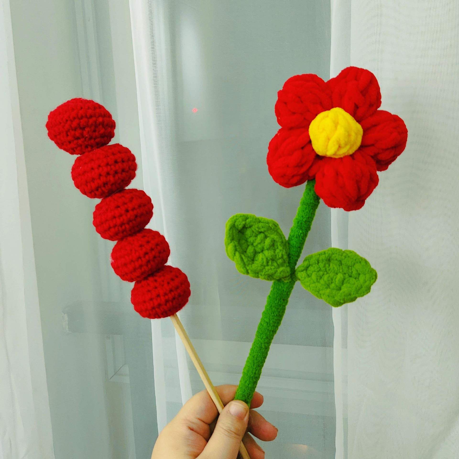 小さな赤い花の毛糸を贈り、手編みのシングルブーケを完成させた女性の日のクリエイティブギフトに。