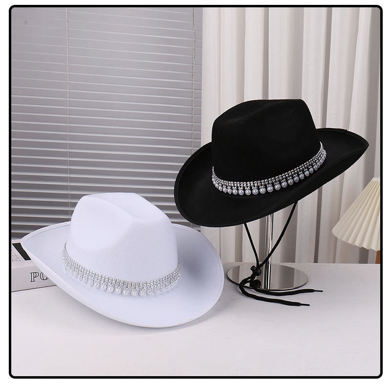 欧美时尚跨境纯色简约珍珠链条装饰牛仔帽舞会派对婚礼装饰礼帽