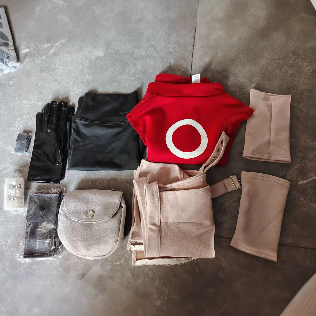 さくら衣装(ジャケット+スカート+レギンス+袖+手袋+ウエストバッグ+クナイバッグ+包帯),赤い額プロテクター,さくらかつら,大きなクナイ,小さなクナイ,手裏剣,忍者靴,さくらマント