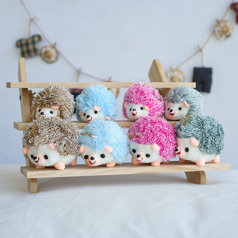 新商品のハリネズミのぬいぐるみが可愛いハリネズミのぬいぐるみのかばんに飾られています。