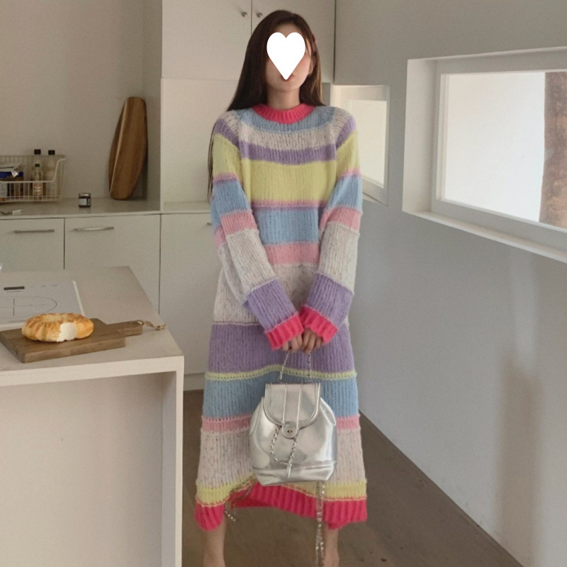 多巴胺彩虹条纹长袖针织连衣裙女秋冬款慵懒风宽松直筒中长款裙子
