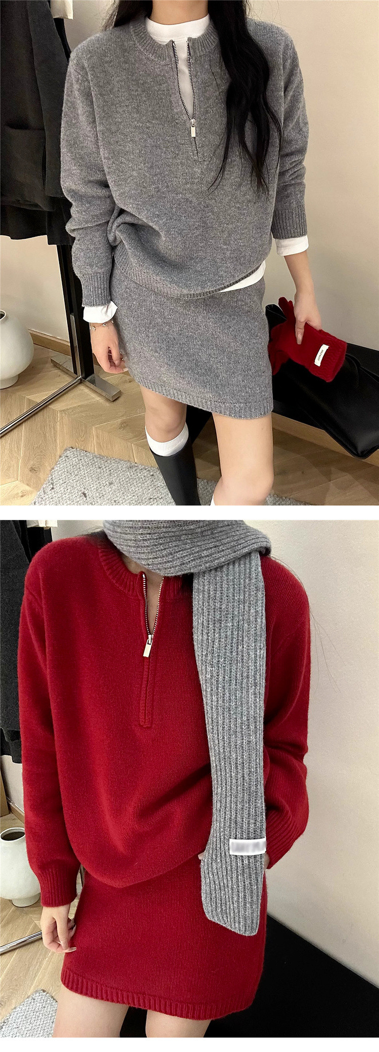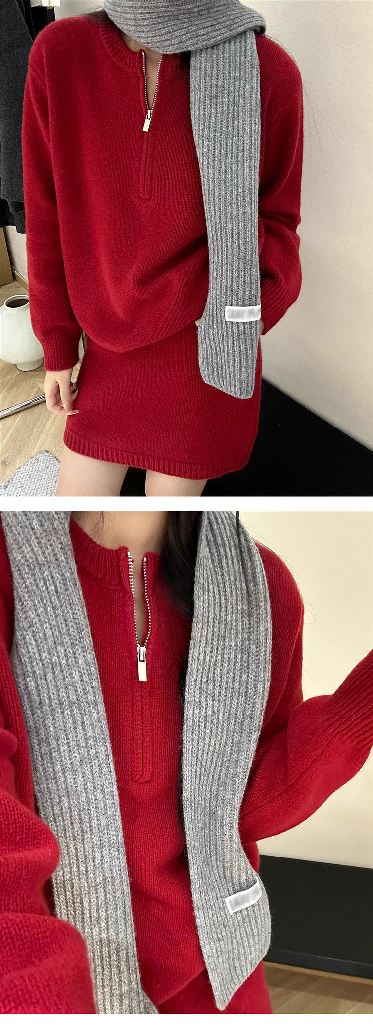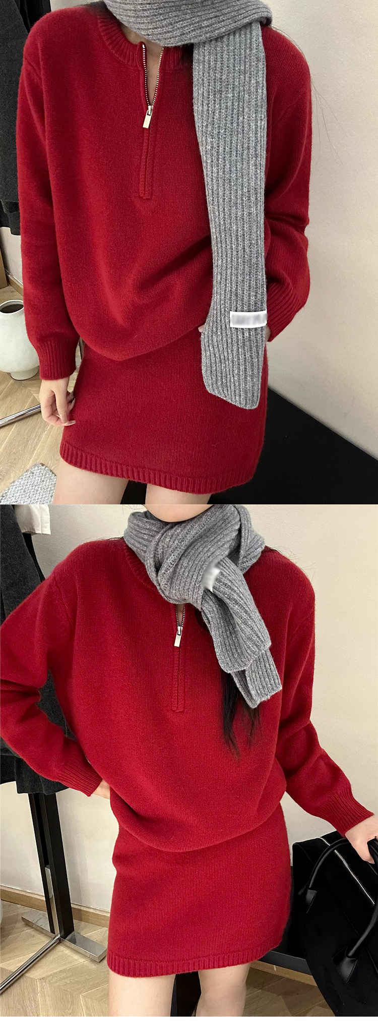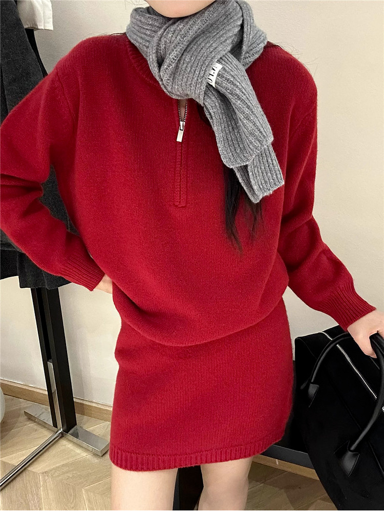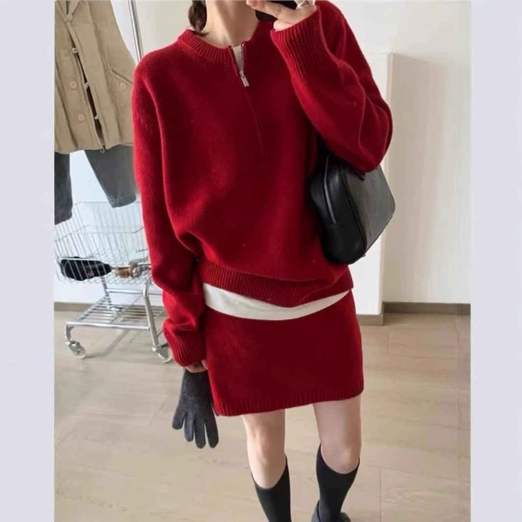 半拉链套头毛衣针织套装女秋冬新款休闲时尚包臂半身裙两件套