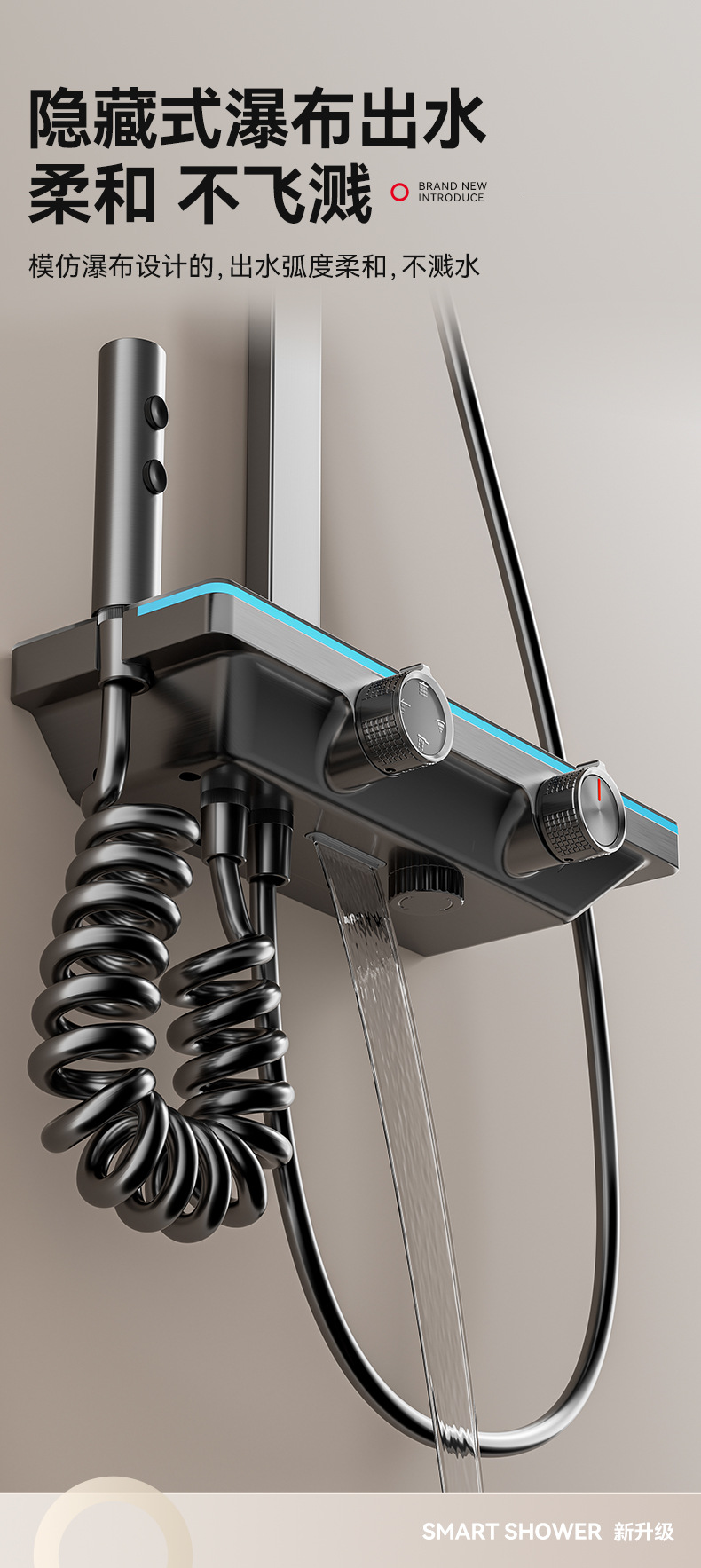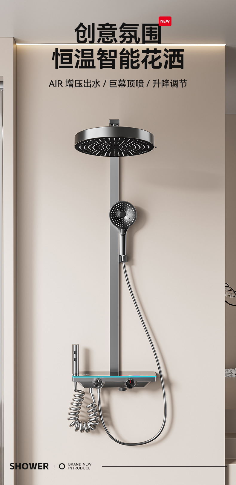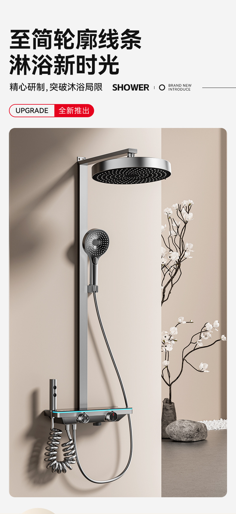 奶白色钢琴数显花洒套装大置物氛围灯家用浴室沐浴淋雨增压腰喷