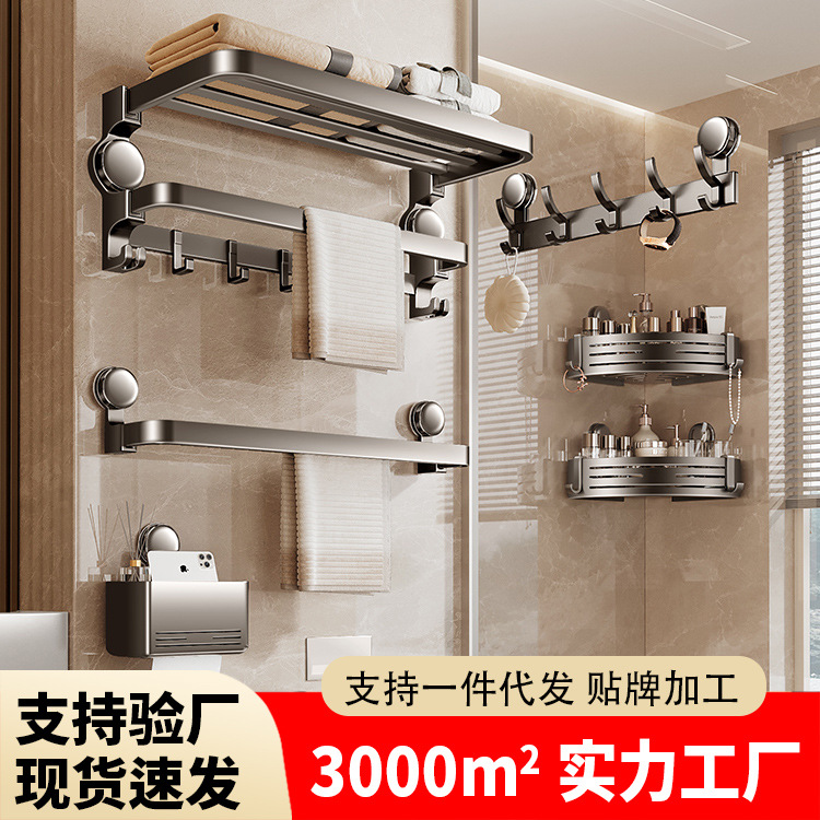 浴室吸盤タオルラック、浴室収納ラック、パンチングフリースペースアルミバスタオルラック、トイレ一体型吊り下げロッドラック