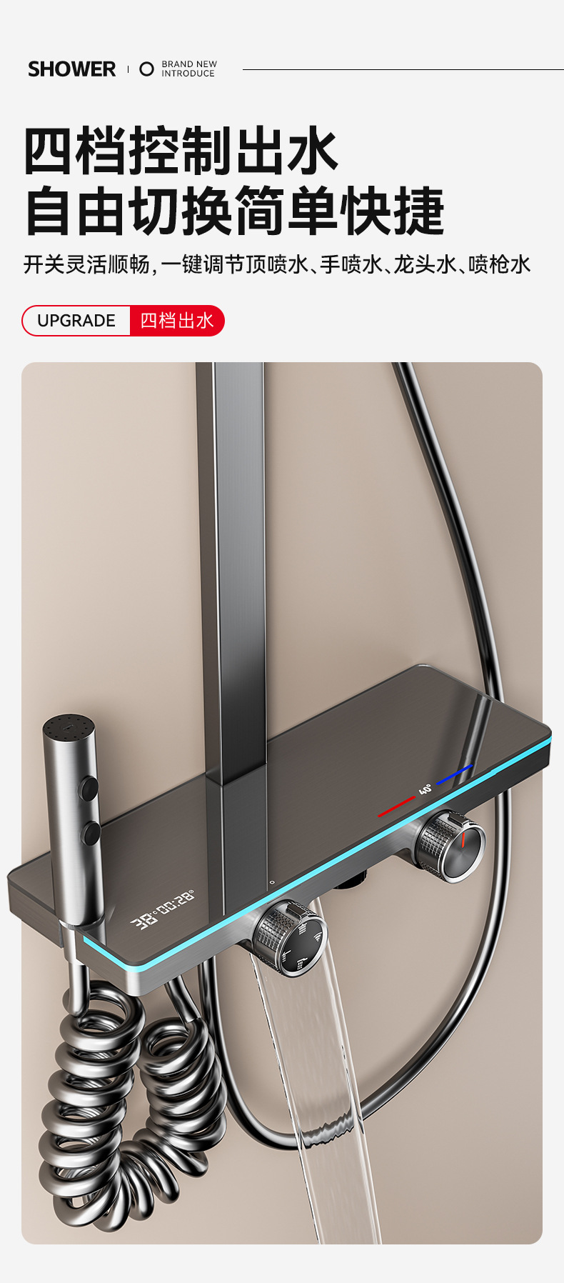 规格 枪灰色-塑料体小航母四档花洒,枪灰色-铝体小航母四档花洒,枪灰色-铜体小航母四档花洒,枪灰色-氛围灯数显航母四档花洒YOY-000102,奶白色-氛围灯数显航母四档花洒YOY-000102