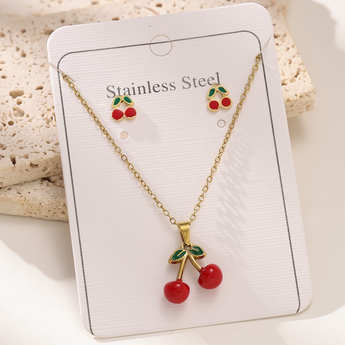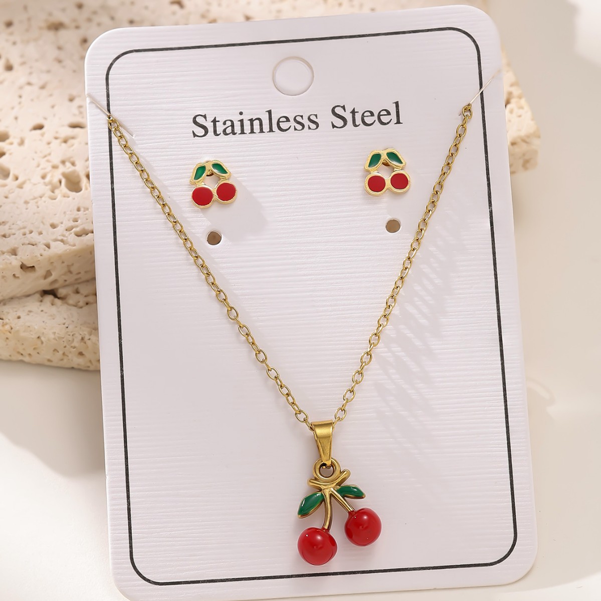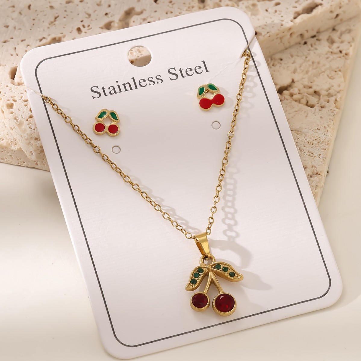 跨境时尚百搭樱桃o字链吊坠锁骨链18K金小众设计感不锈钢耳饰套装