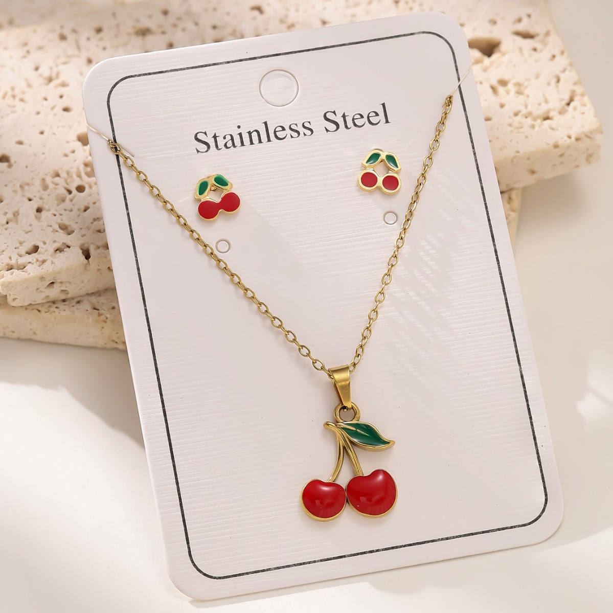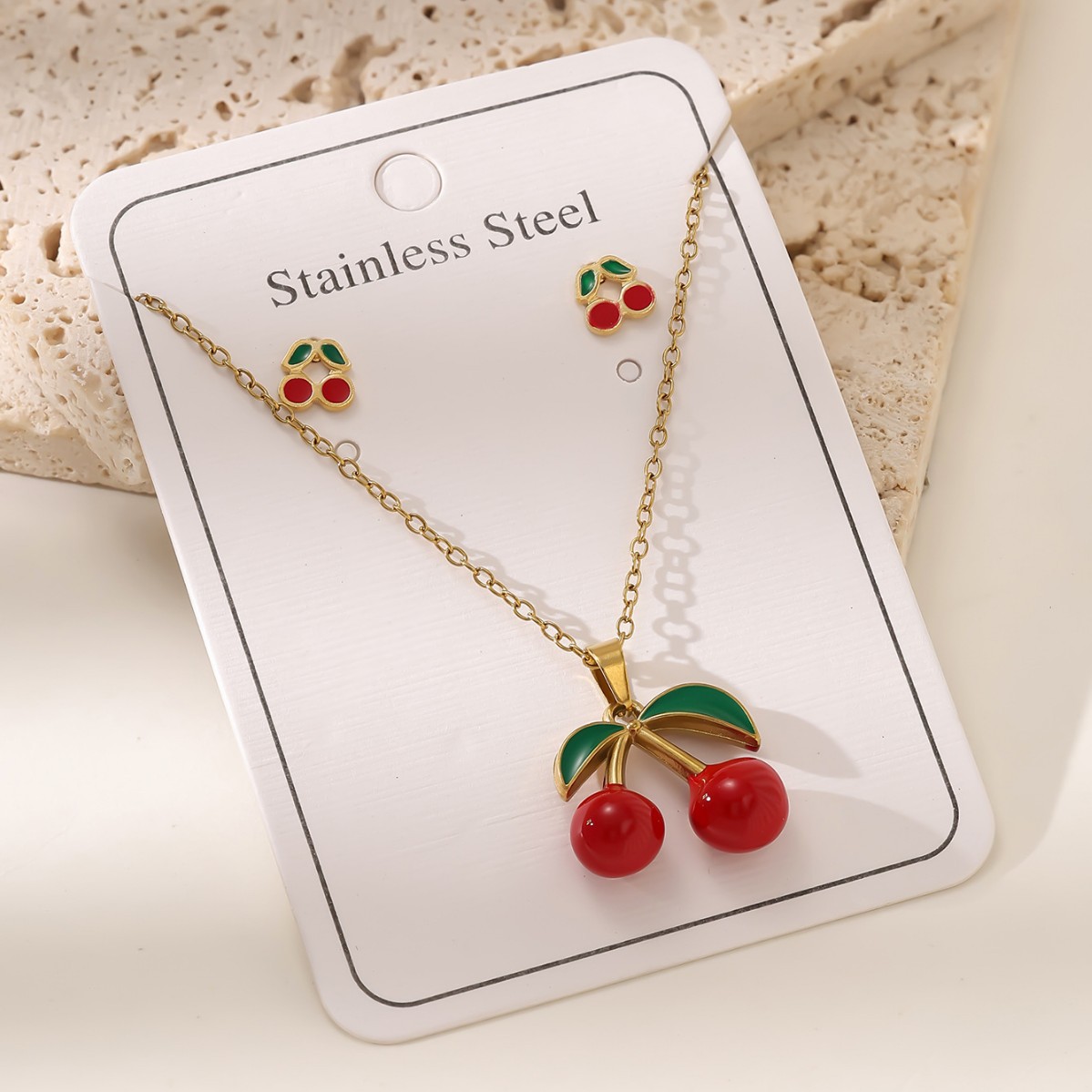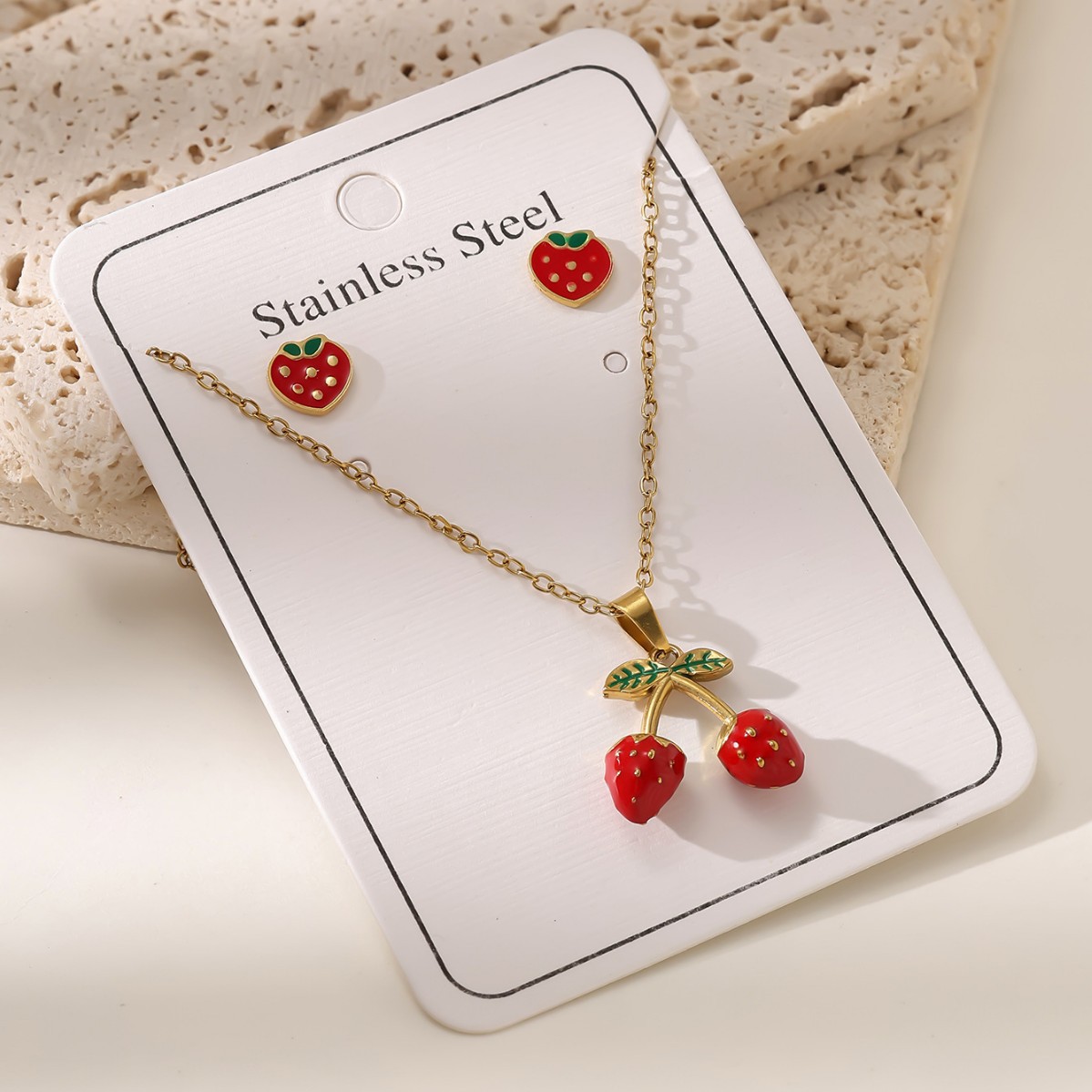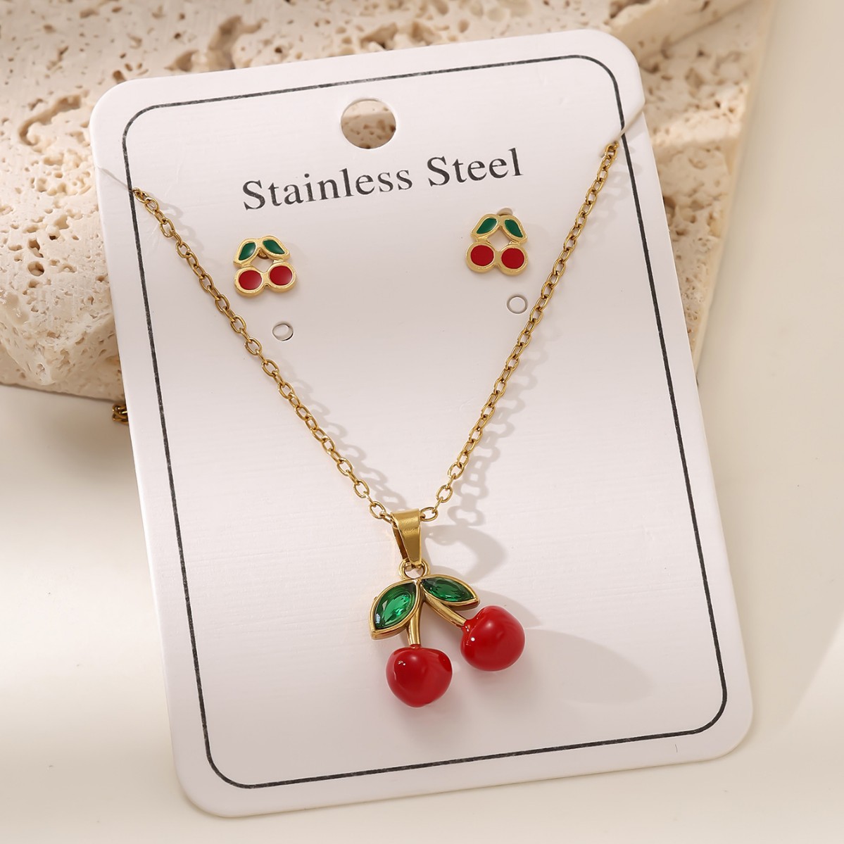 跨境时尚百搭樱桃o字链吊坠锁骨链18K金小众设计感不锈钢耳饰套装