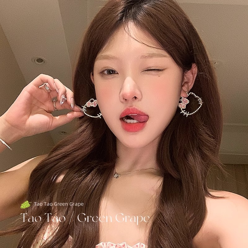 可爱少女HelloKitty碎钻耳环女2025新款方圆脸耳钉独特KT猫耳夸张