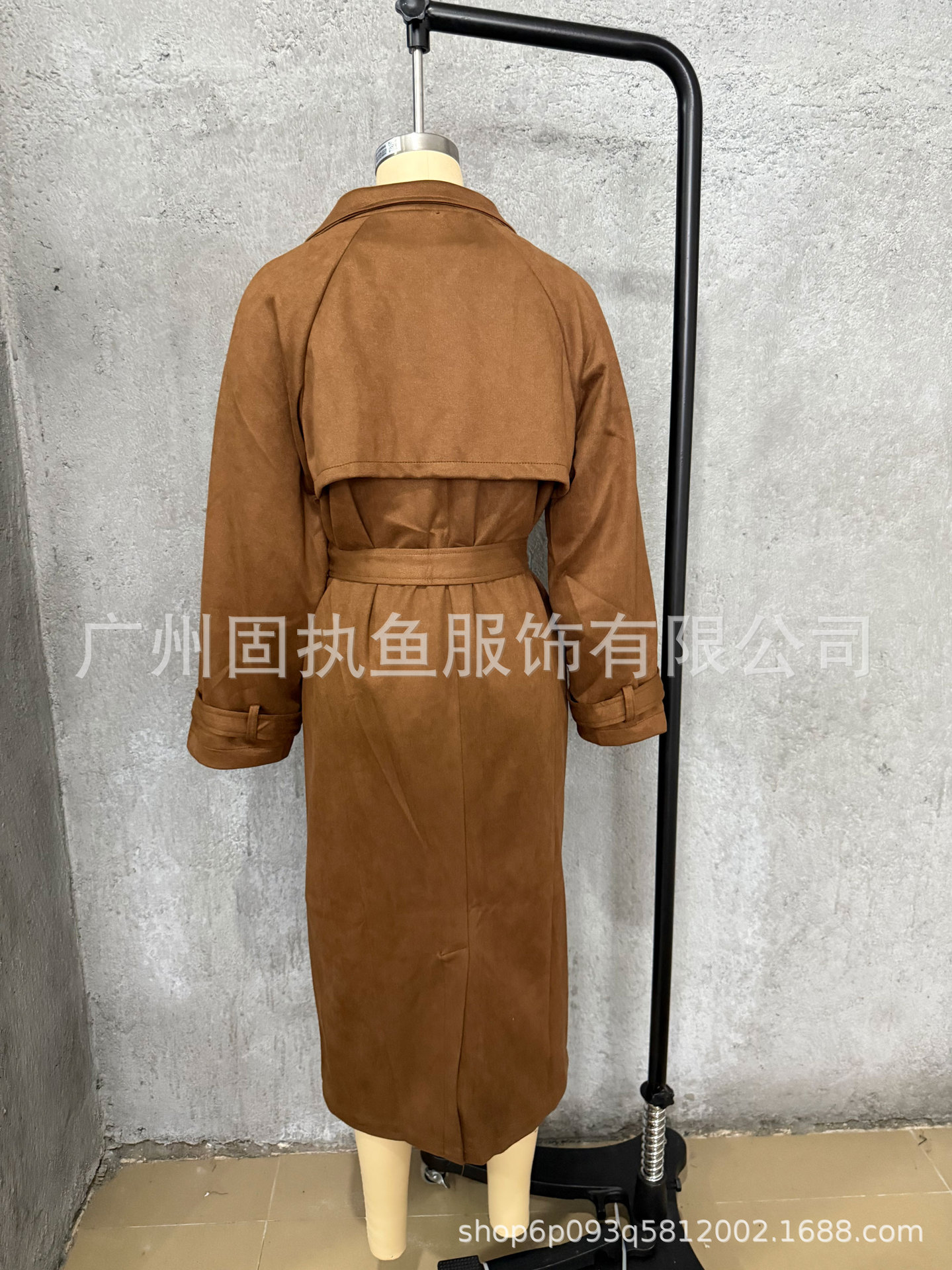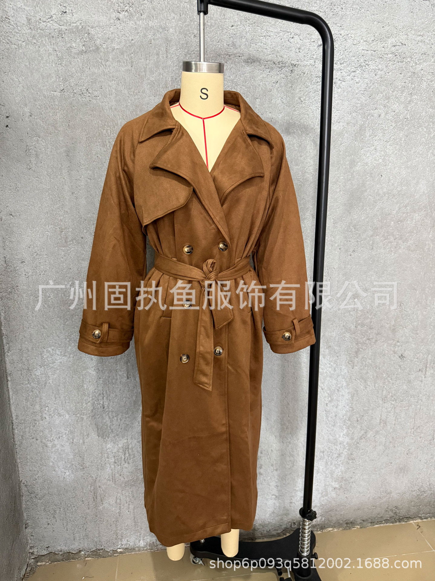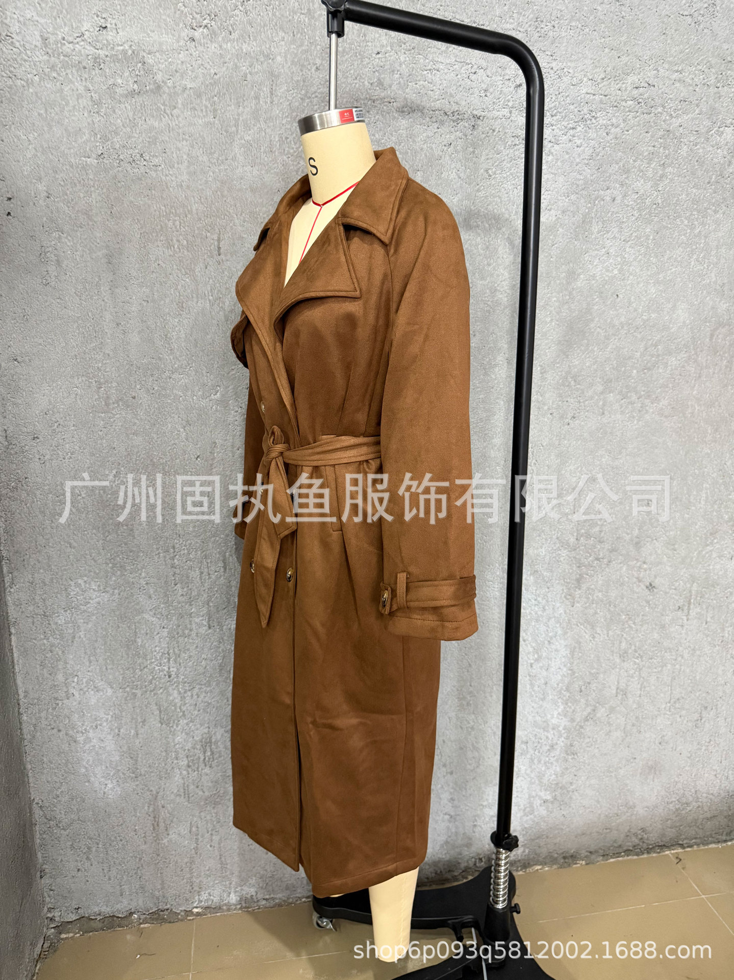 现货2025外贸秋季新款欧美风双排扣翻领系腰带长款夹克风衣外套
