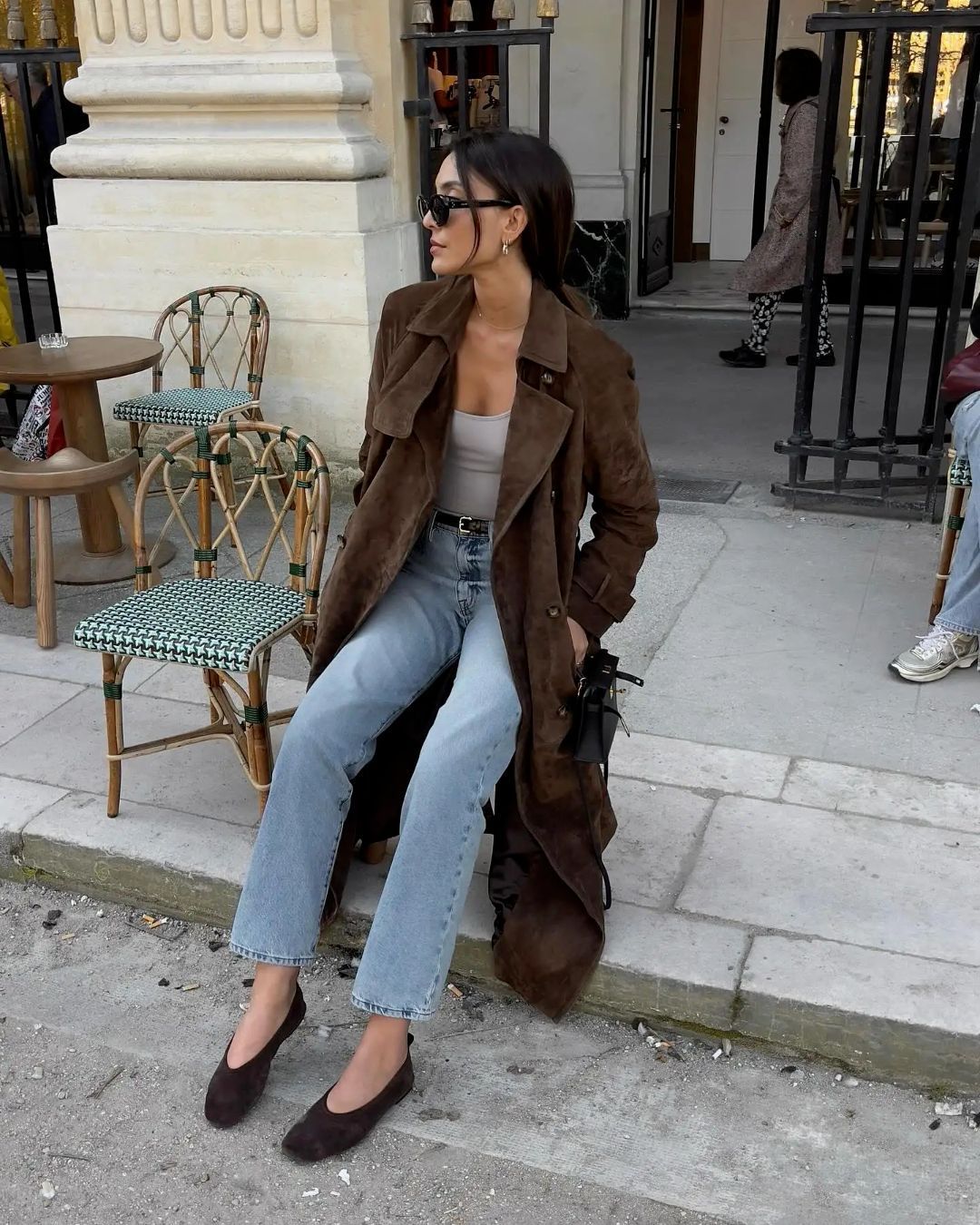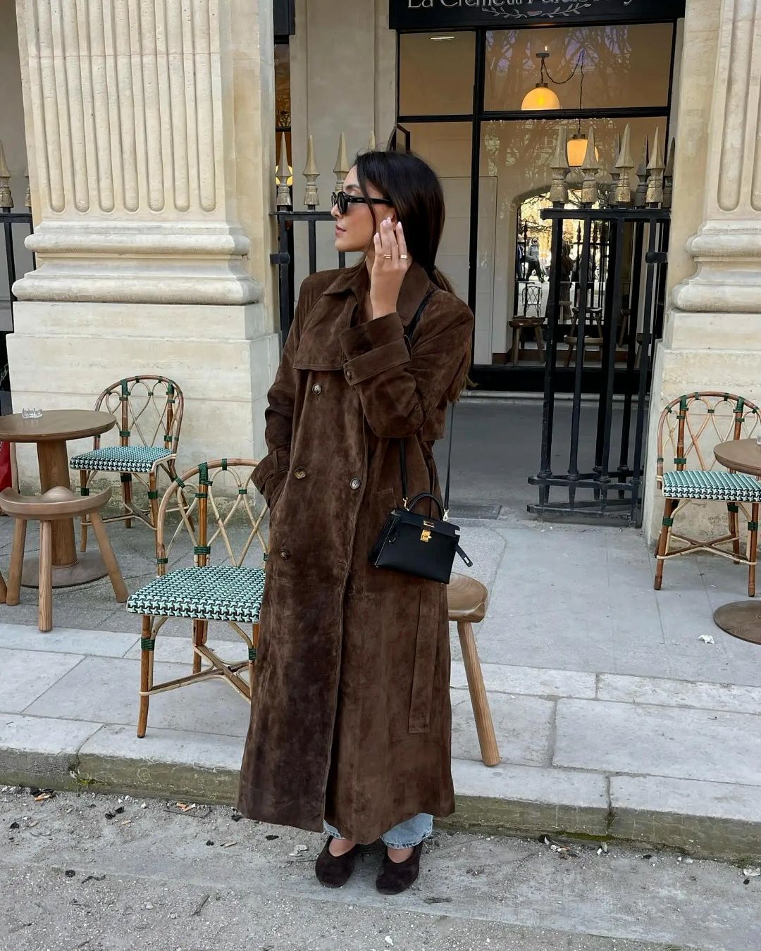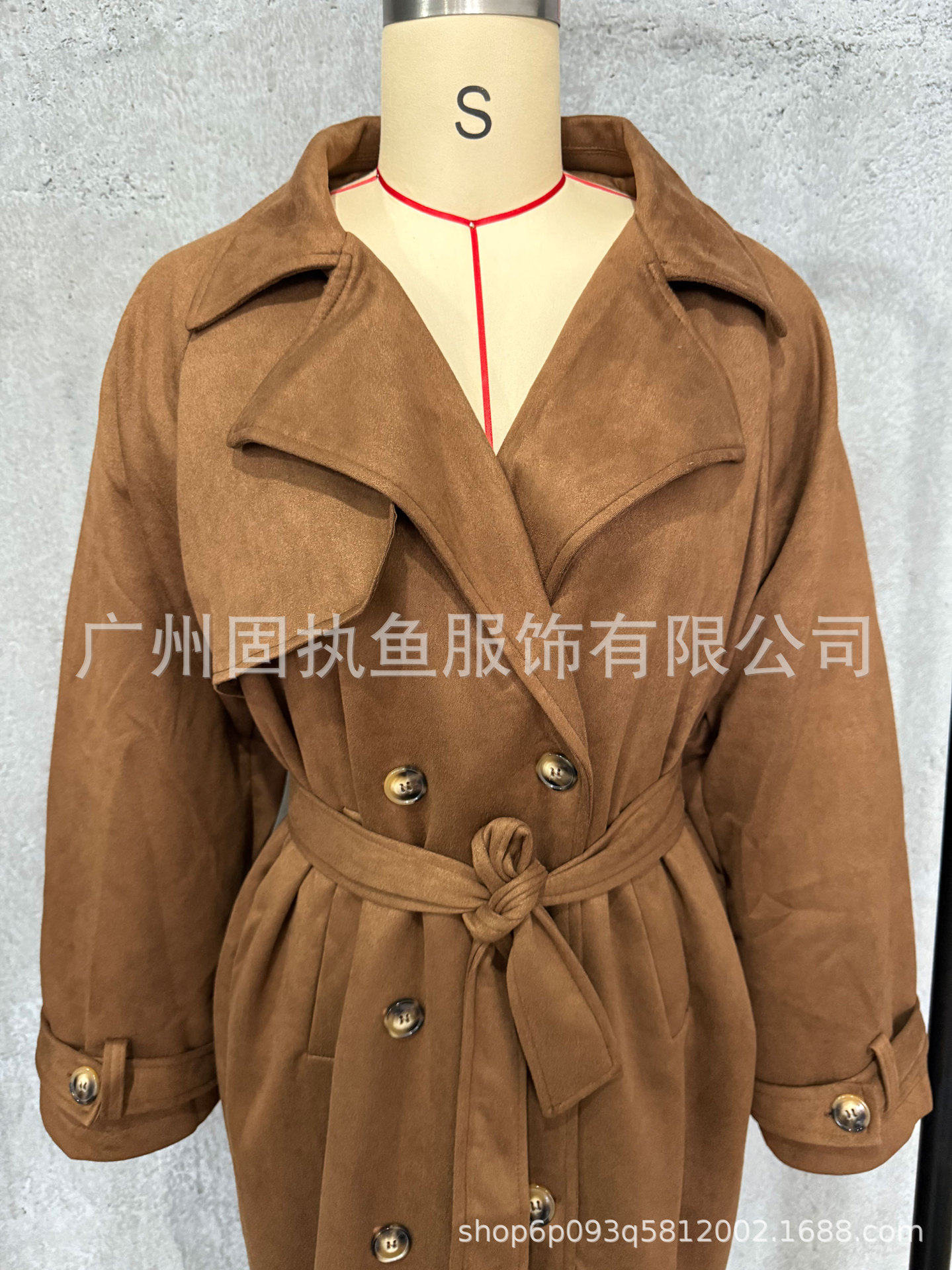 现货2025外贸秋季新款欧美风双排扣翻领系腰带长款夹克风衣外套