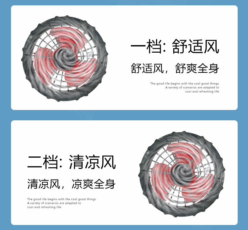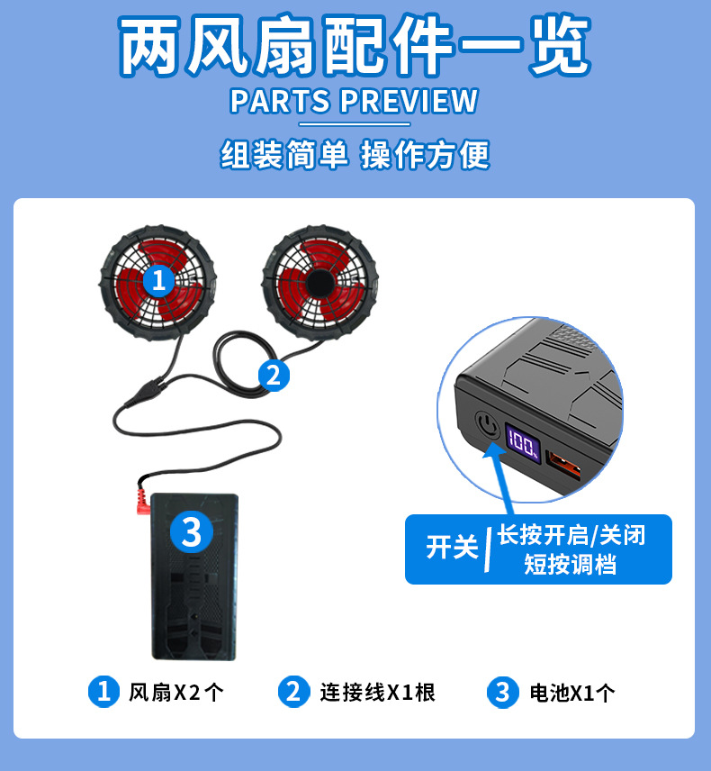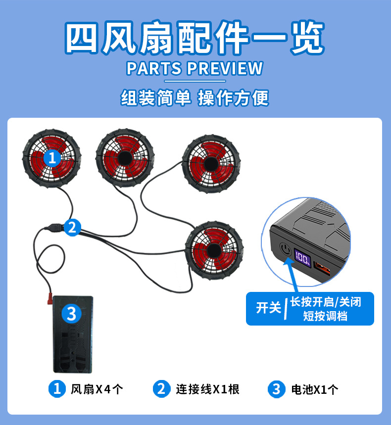 颜色 4风扇-蓝灰单衣服,4风扇灰蓝-单衣服,4风扇蓝绿-单衣服,2风扇蓝灰-单衣服,2风扇灰蓝-单衣服,2风扇蓝绿-单衣服,4个12V风扇+1根DC连接线,4个5V风扇+1根USB连接线,2个12V风扇+1根DC连接线,2个5V风扇+1根USB连接线,12V电池-2W,5V电池-2W,12V大电池-3W