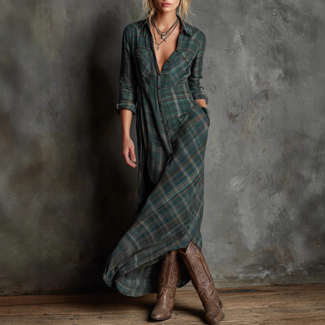2025跨境欧美女装气质优雅长袖格子衬衫裙时尚格纹衬衫领连衣裙