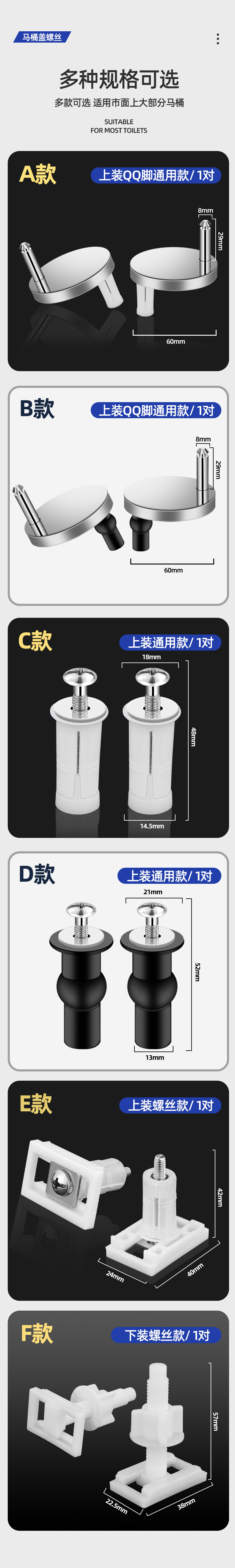 规格 亮银盖【A款】上装QQ脚-通用款,拉丝盖【B款】上装QQ脚-通用款,【C款】上装通用款/1对,【D款】上装通用款/1对,【E款】上装螺丝款/1对,【F款】下装螺丝款/1对