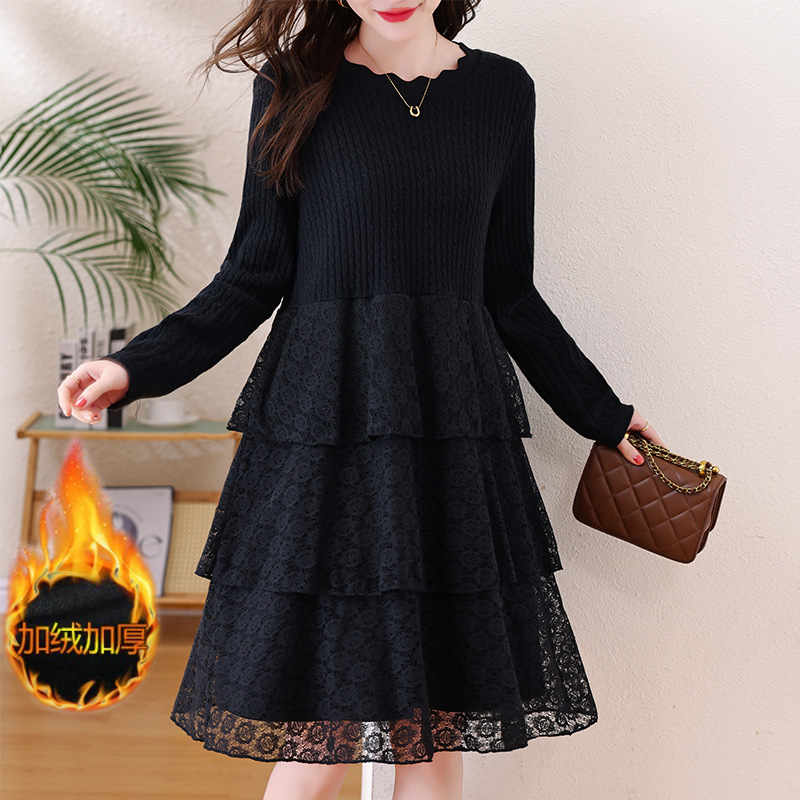 yek1866加绒加厚连衣裙女2025秋冬针织拼接蕾丝遮肚显瘦蛋糕裙