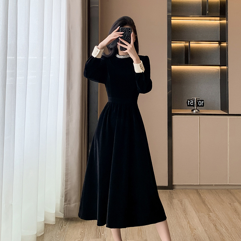 xmyf152新年战袍丝绒黑色长裙2025秋冬新款收腰显瘦赫本风连衣裙
