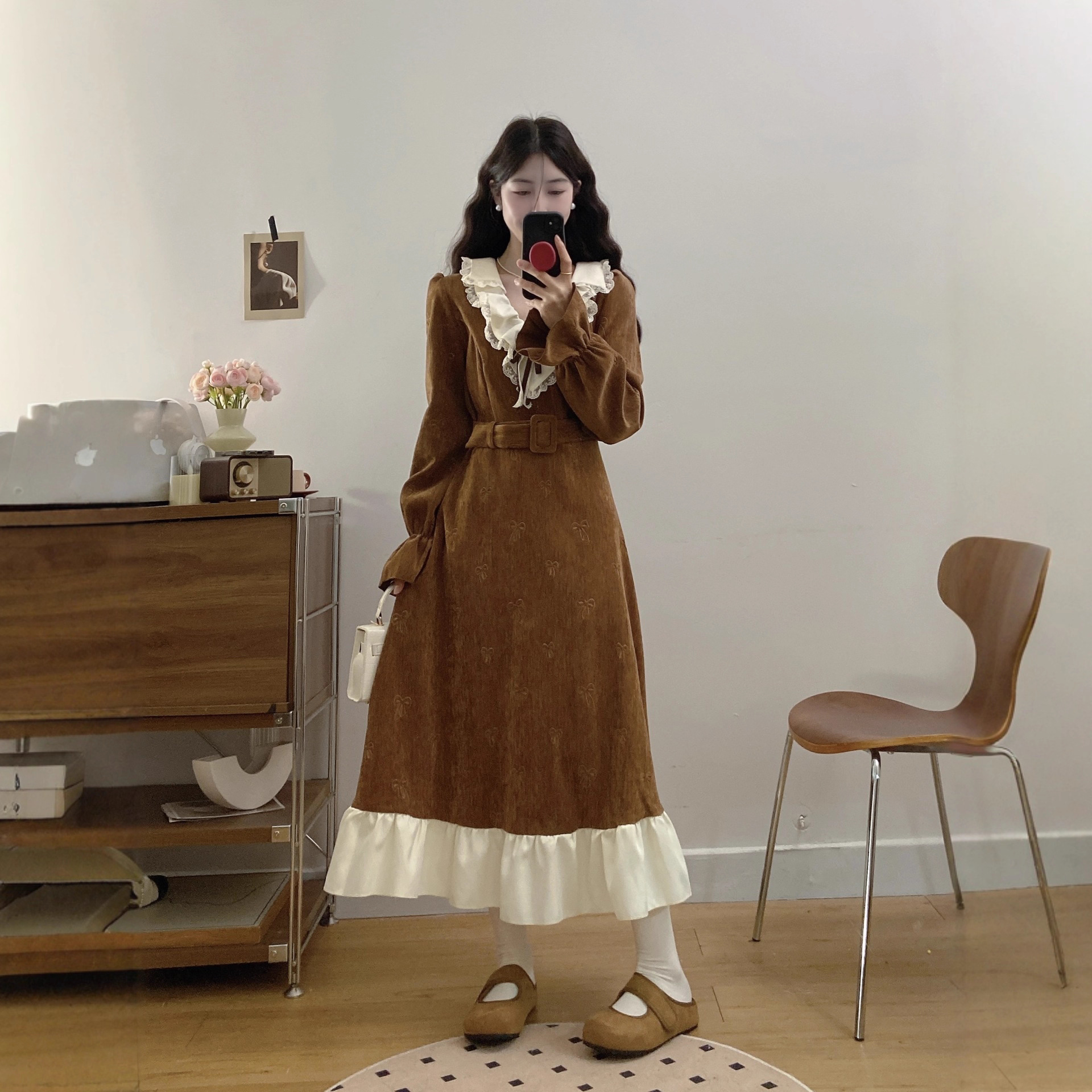 mfdm85599复古田园风收腰长裙2025秋冬新款设计感荷叶边连衣裙女