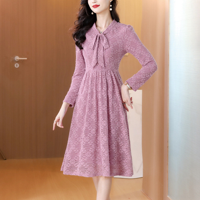 bynz6617紫色蕾丝飘带领连衣裙女2025秋冬收腰显瘦温柔风打底裙