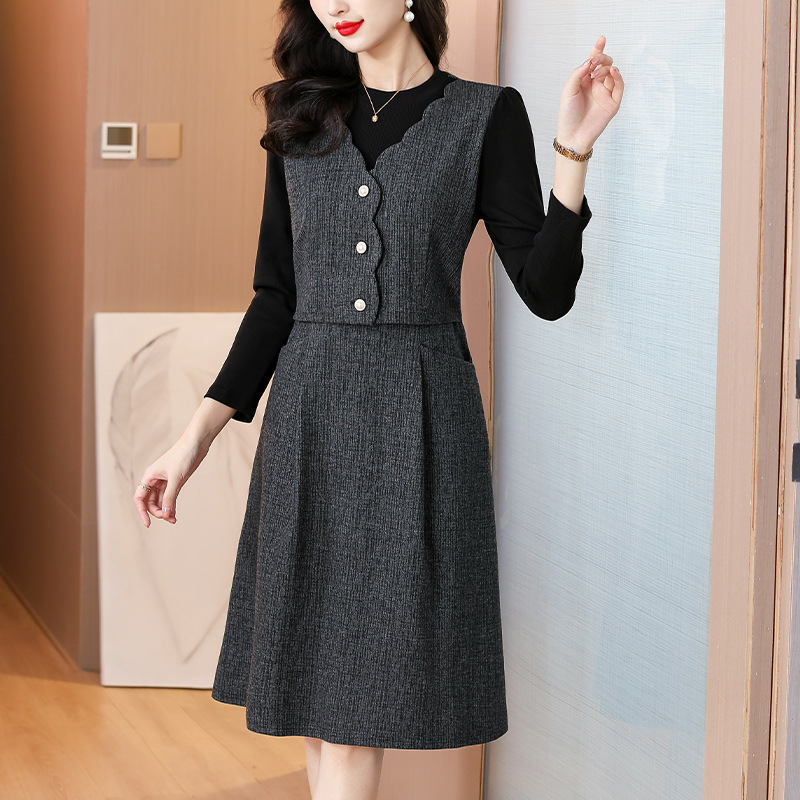 bynz6688假两件长袖纽扣收腰连衣裙2025秋冬气质通勤中长款格纹裙