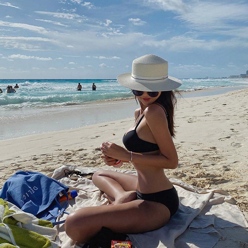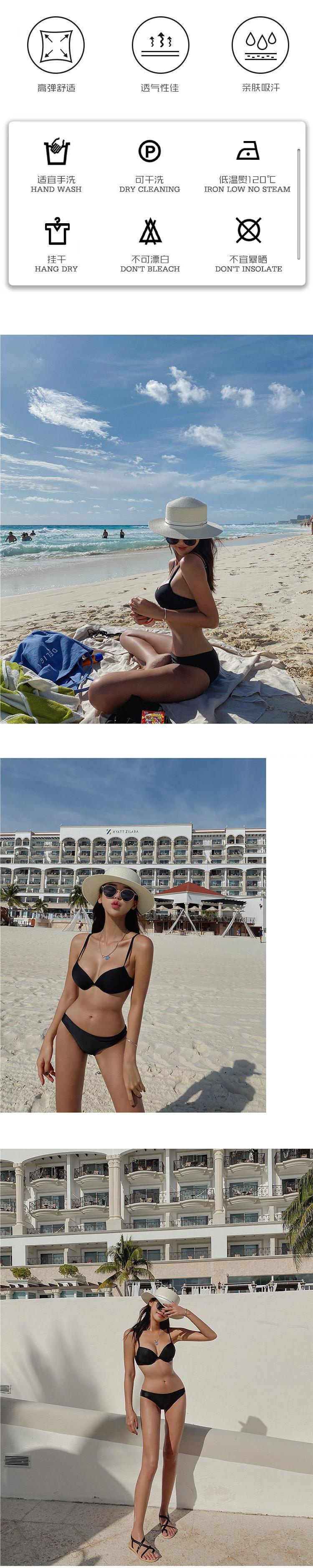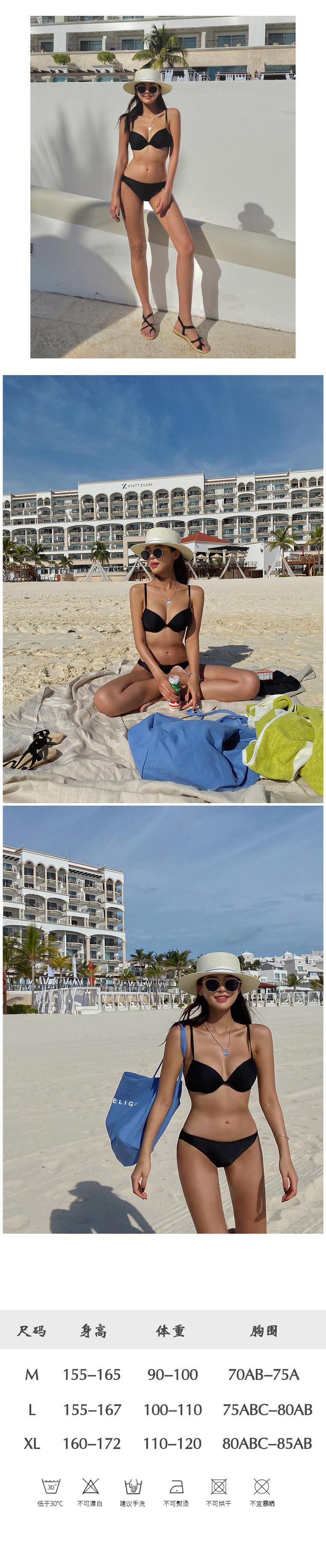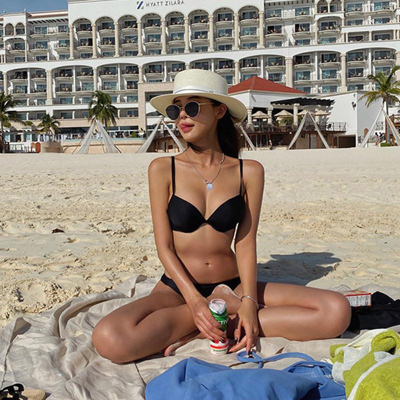 韓国製女性用水着、セクシーなインス風黒の三角ビキニ、スリーポイントタイプ、スチール入り、プッシュアップ効果のあるビキニ