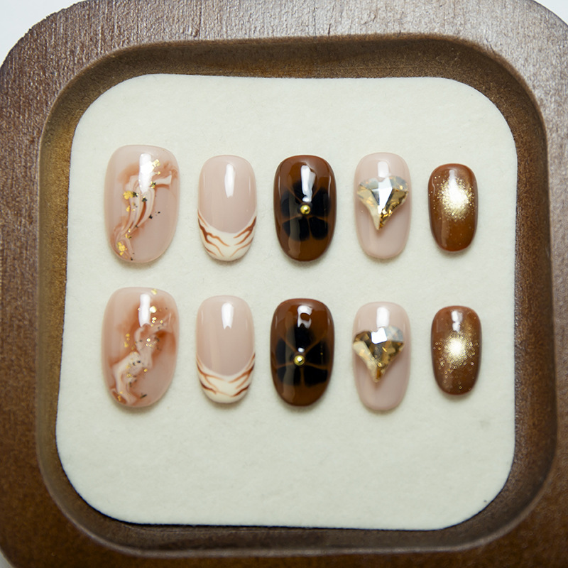 纯手工穿戴甲高级美甲秋冬新款墨染琥珀椭圆美甲假指甲外贸款美甲