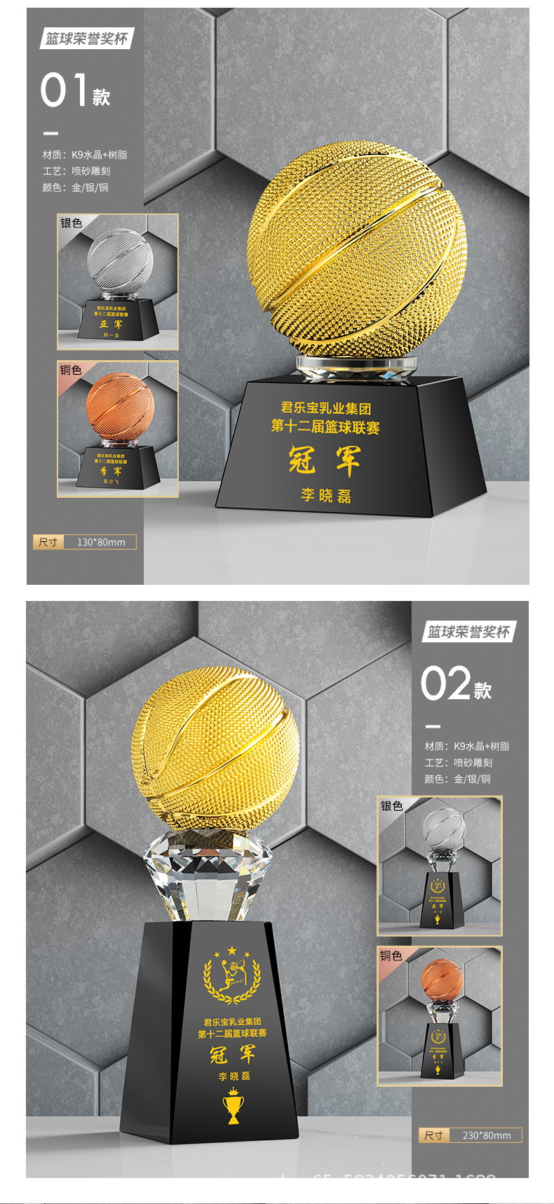 高档水晶篮球奖杯奖牌比赛事颁奖MVP优秀球员学生体育院校运动会