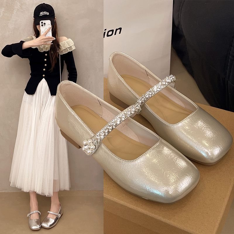 フレンチシャンパンゴールドラインストーンフラットメリージェーンシューズ2025新しいスクエアトゥ浅い口ソフトソール多用途女性用シングルシューズ