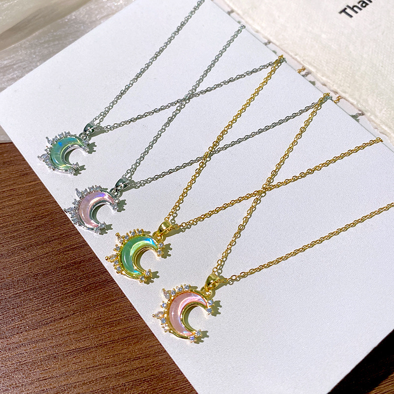 新款月光彩色树脂月亮项链女钛钢链条铜镶嵌锆石吊坠气质爆款饰品