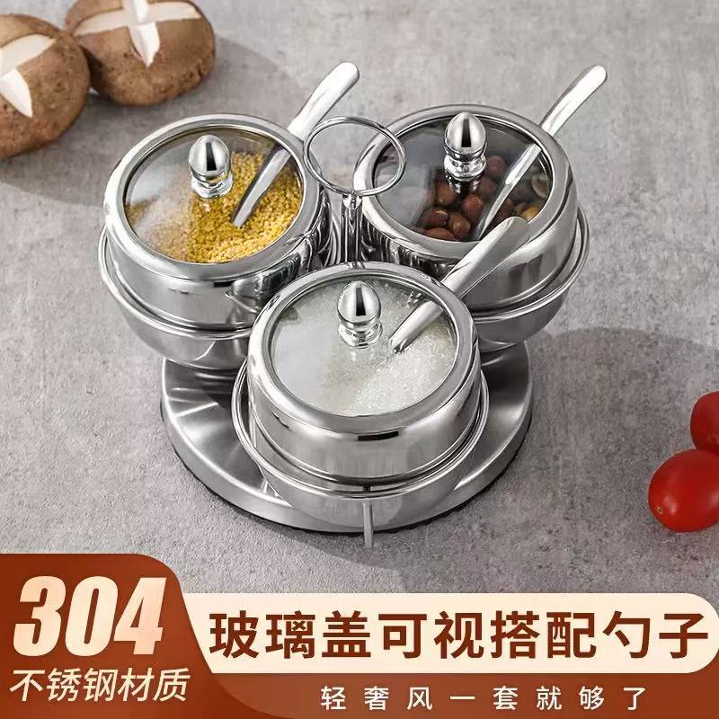 亚马逊跨境 304不锈钢调味罐带盖带勺糖盐香料旋转味盅调料盒套装