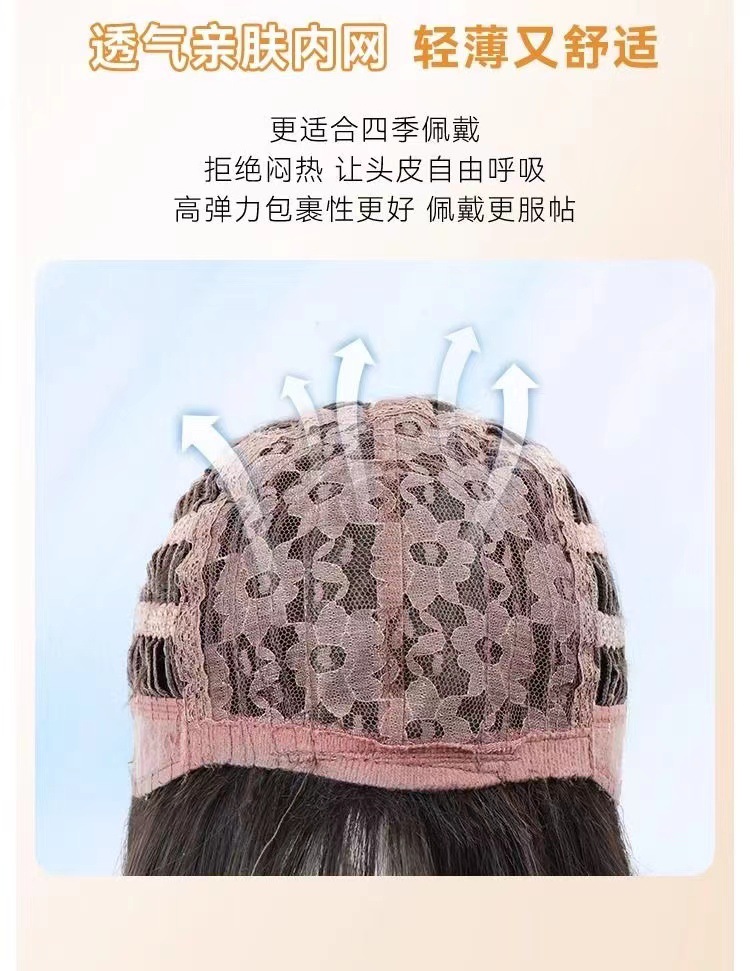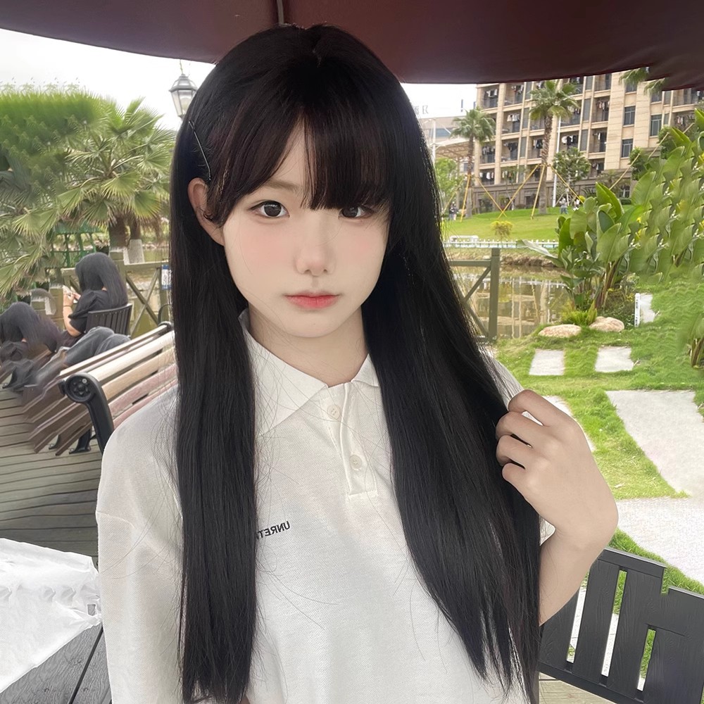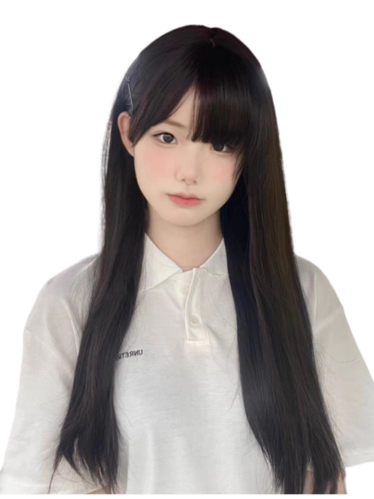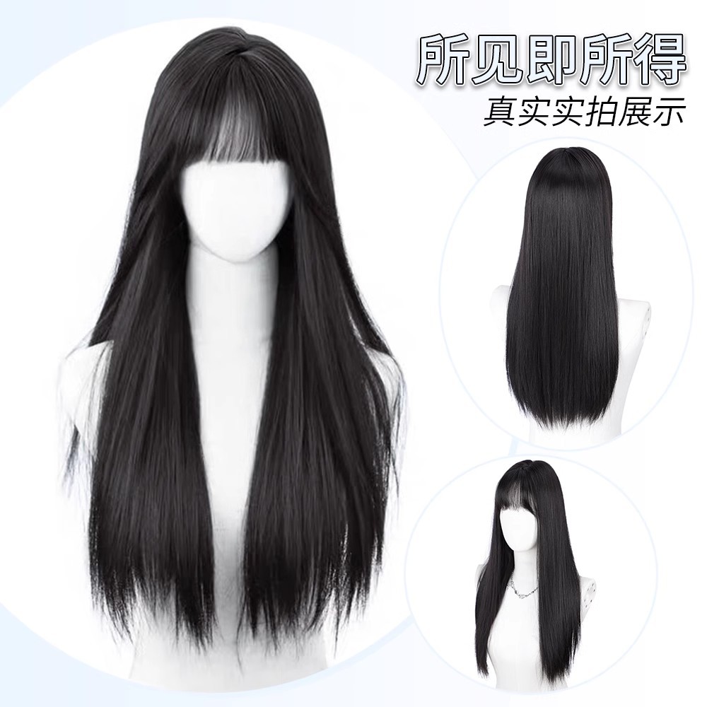 女性用ウィッグ、美白、シームレス、女子グループスタイル、自然で通気性のある黒のロングストレート、丸顔の学生前髪、人工毛フルヘッドギア