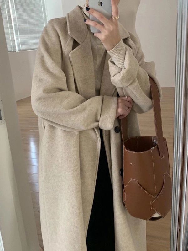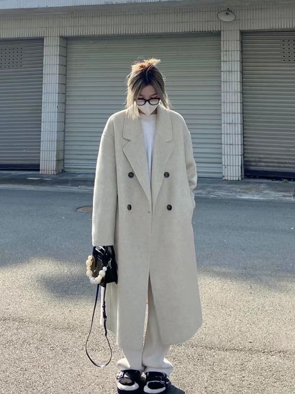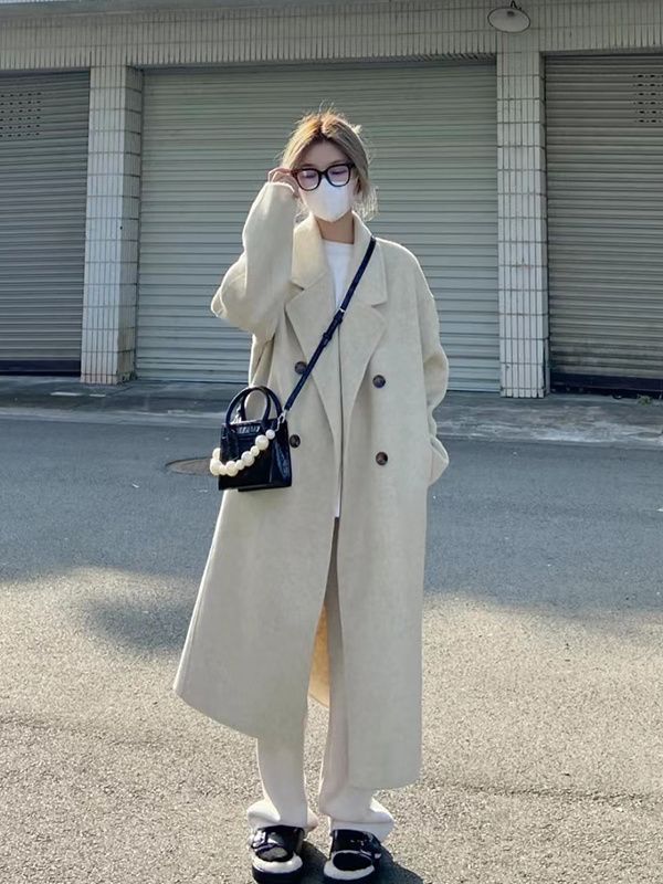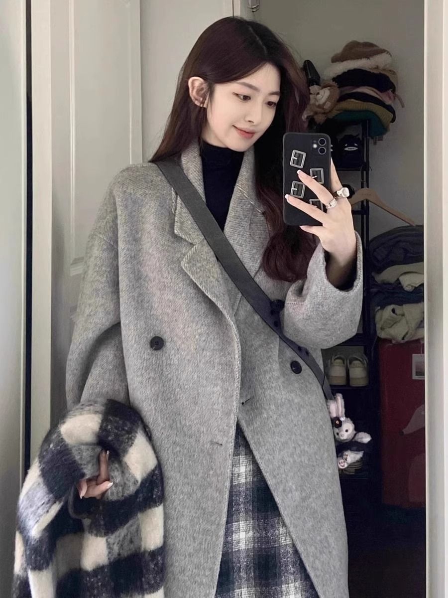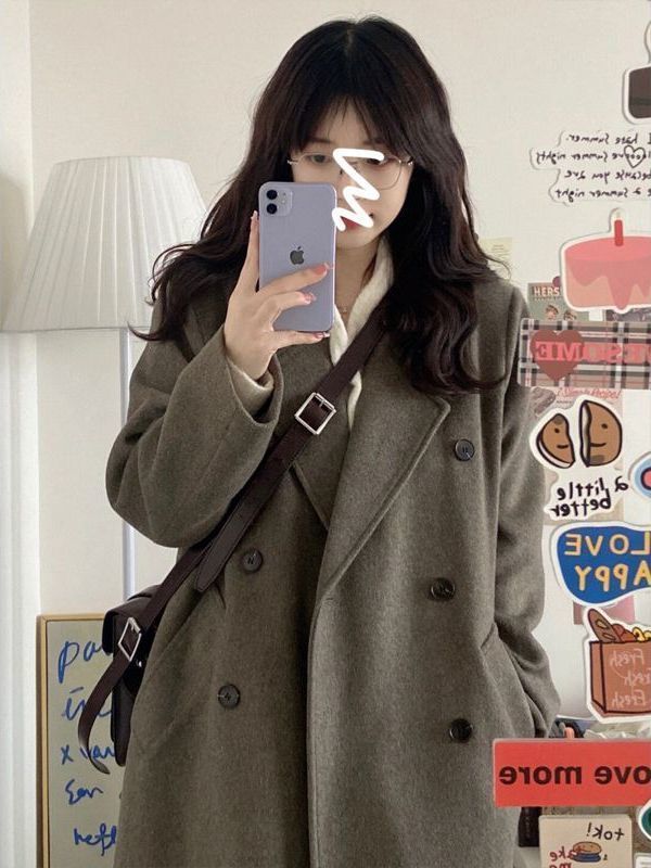 韩系青果领毛呢大衣女2025秋冬新款中长款宽松高级感毛呢外套潮