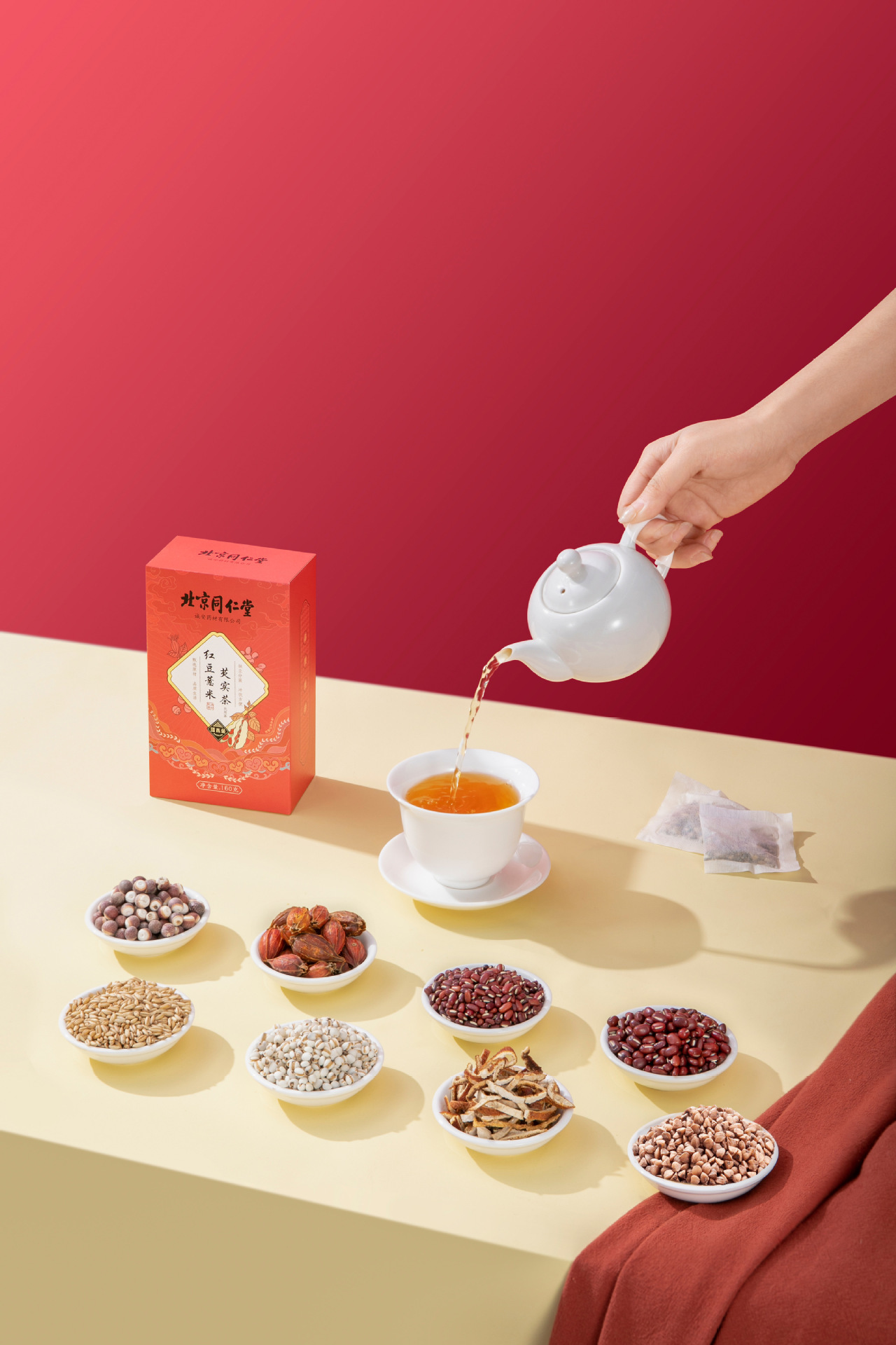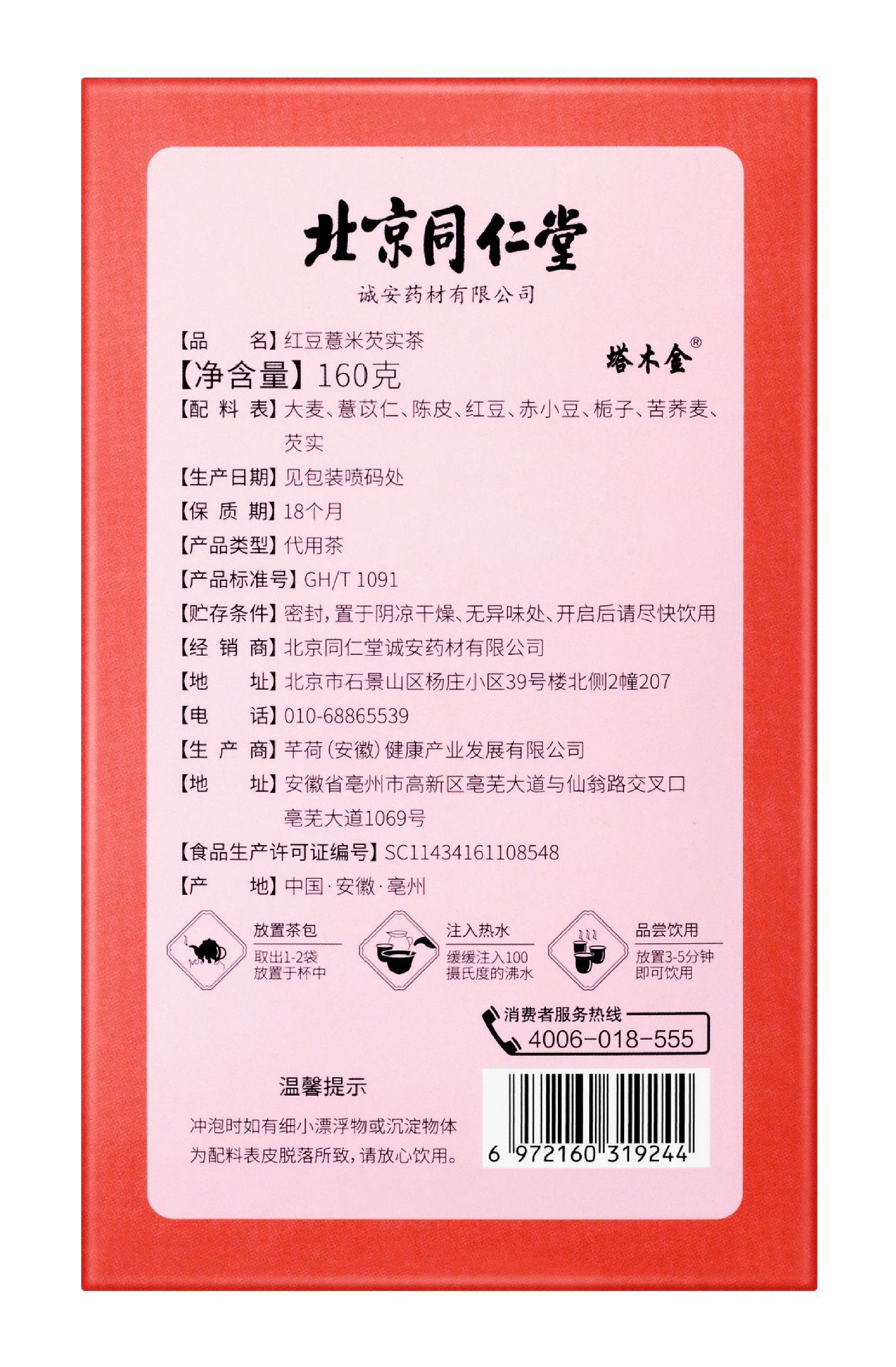 北京同仁堂内廷で塔木金紅豆ハトムギとオニバスの実茶160グラムを使います。