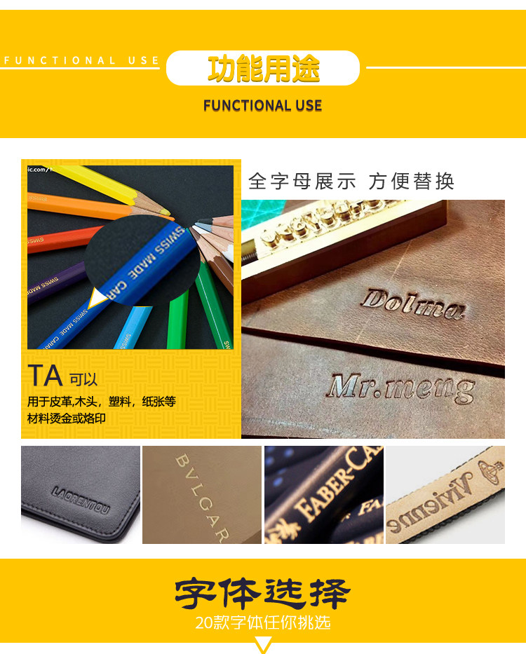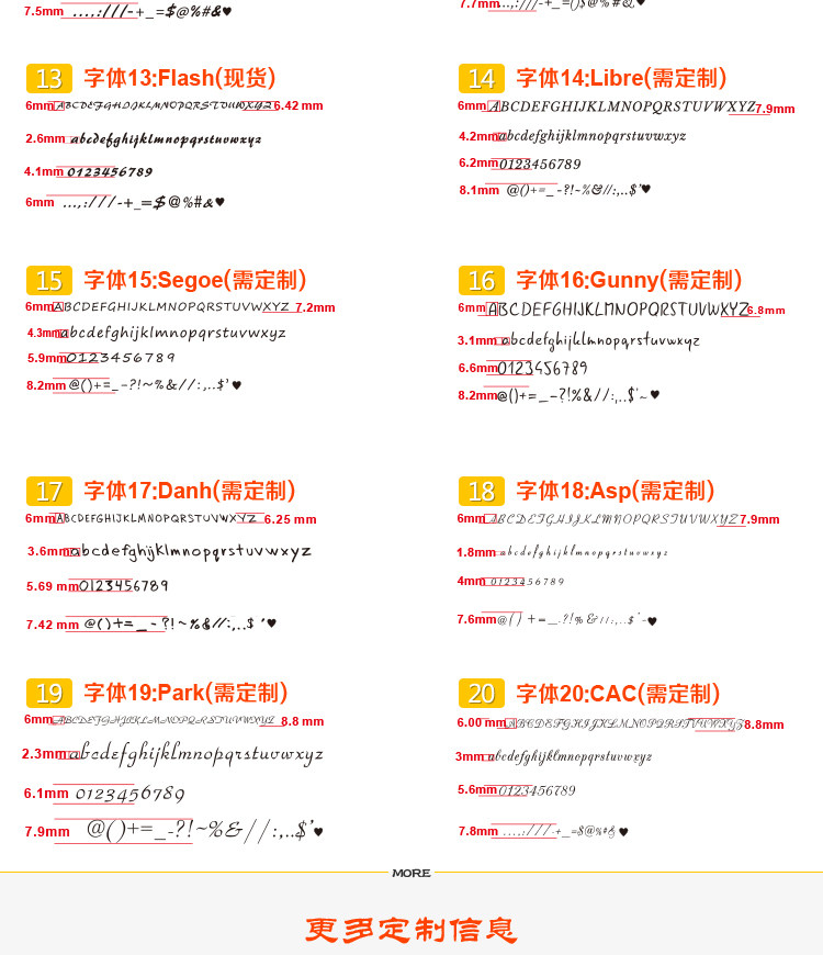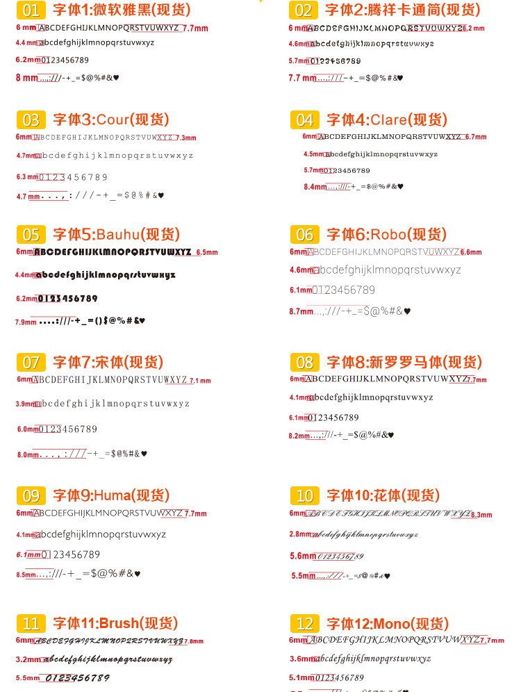 现货有20款字体可选,定制提供160款字体可选,可提供字体定制。