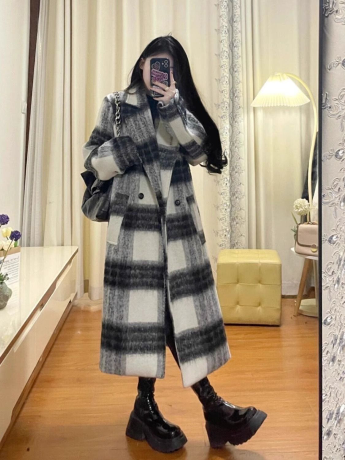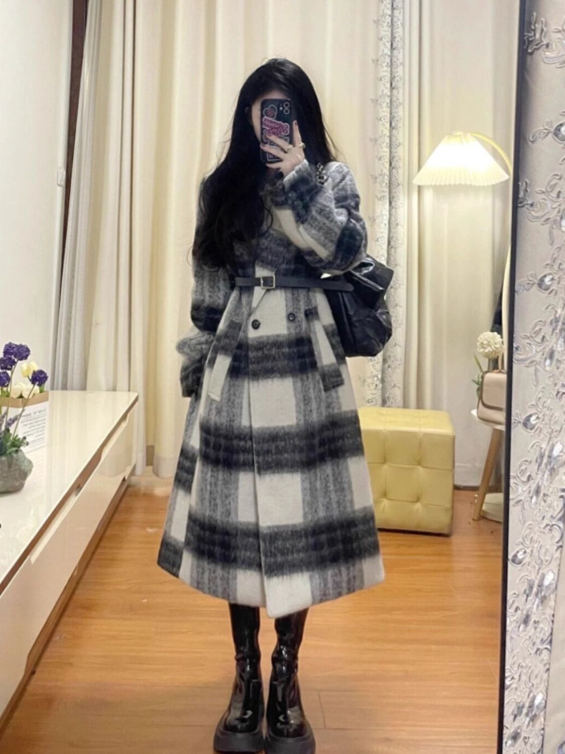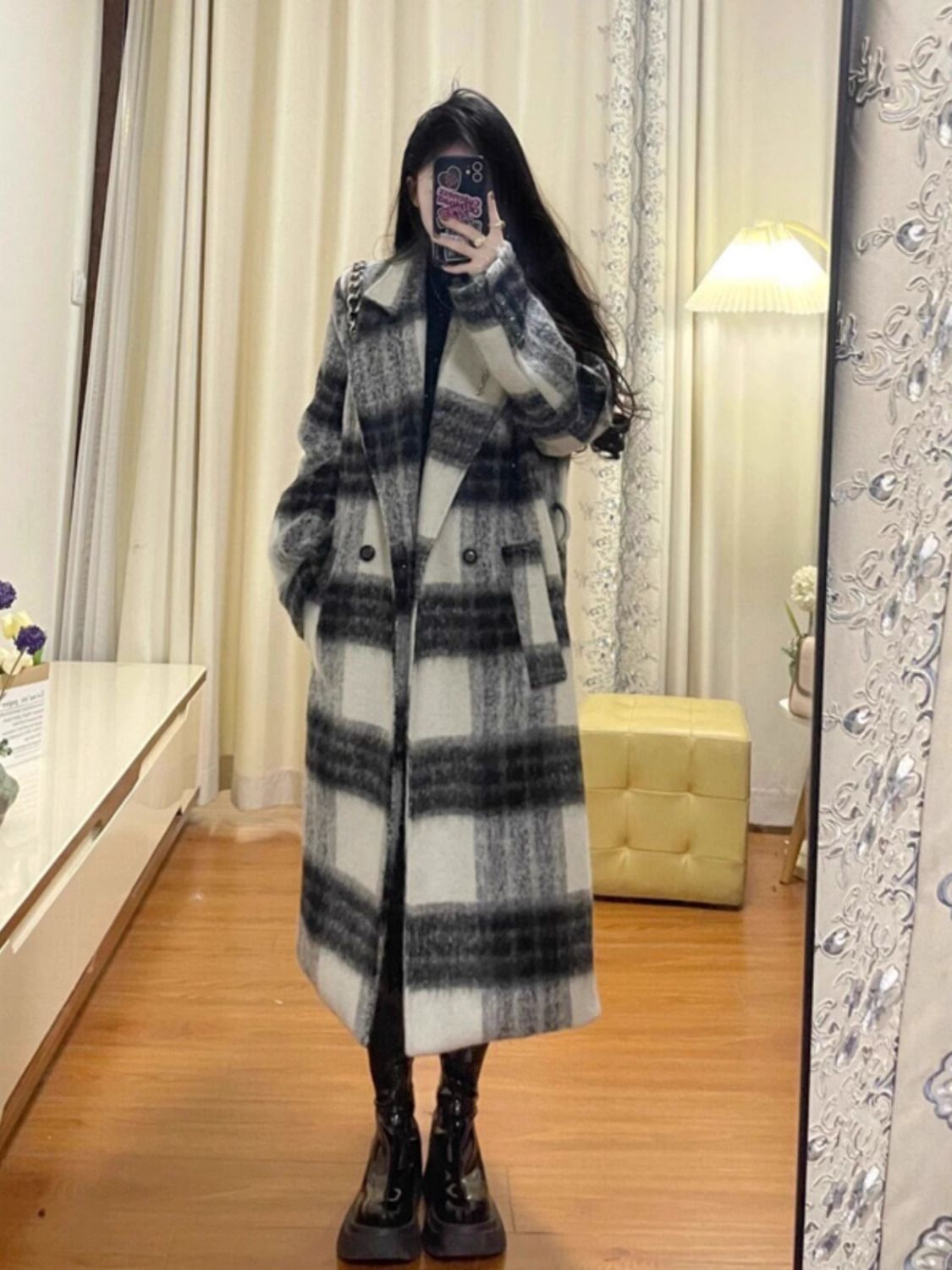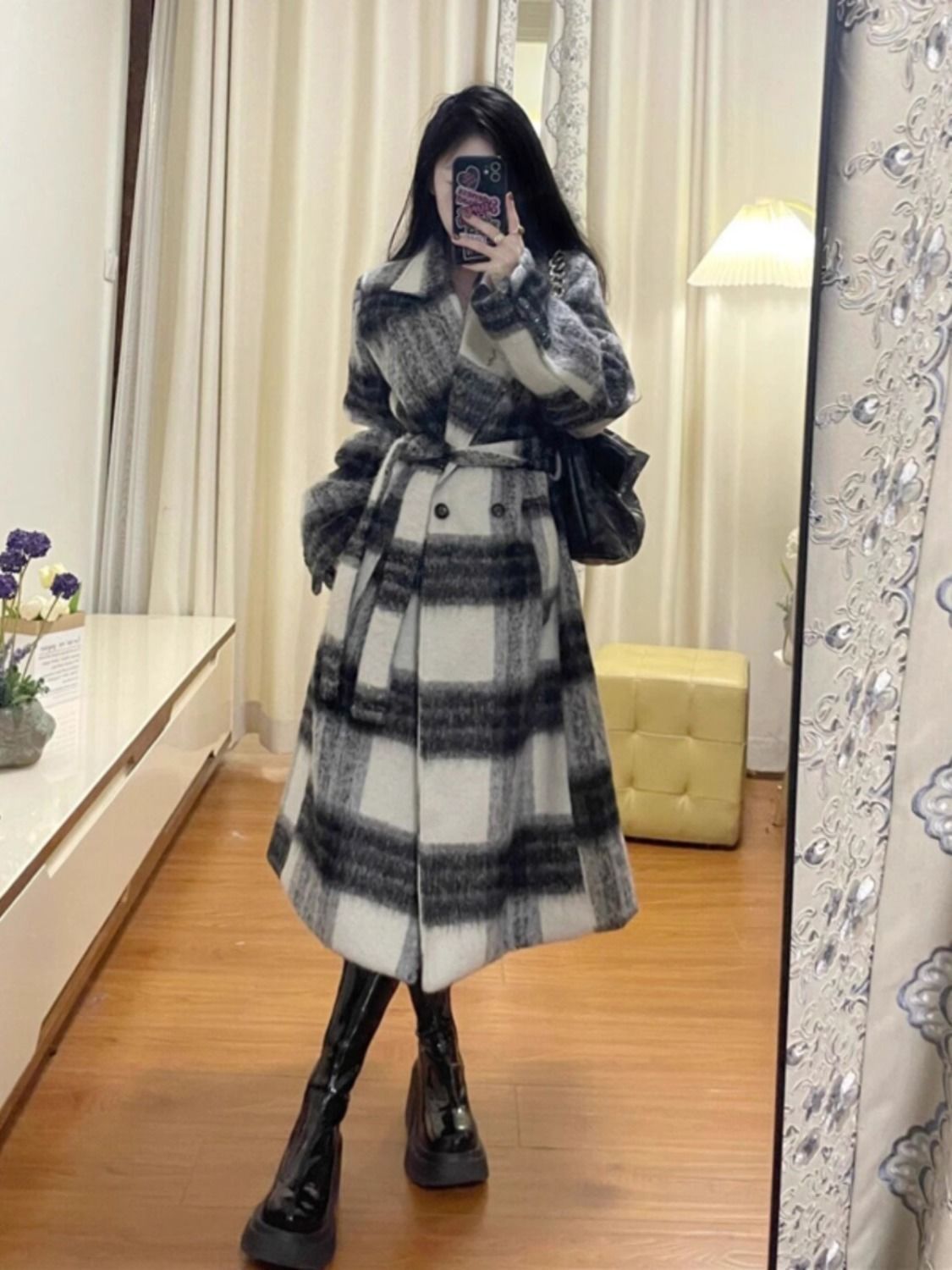 2025年秋冬新款高级感韩系格子呢子大衣女加长款宽松休闲外套女