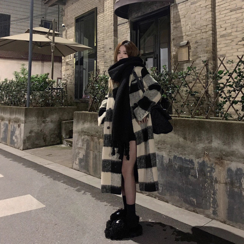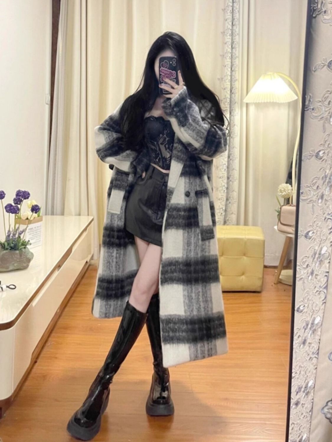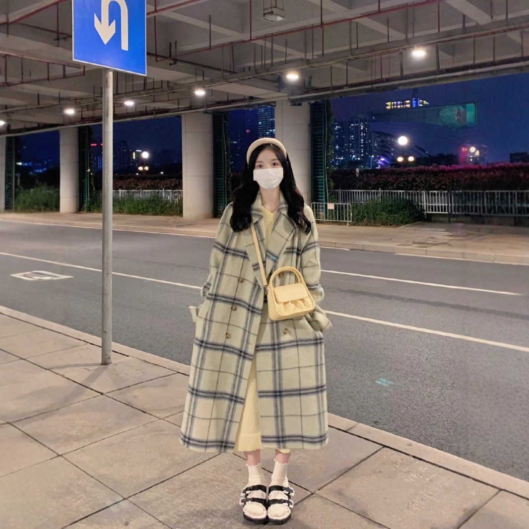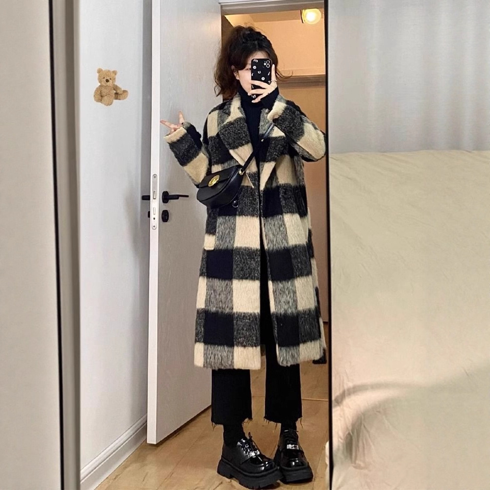 2025年秋冬新款高级感韩系格子呢子大衣女加长款宽松休闲外套女