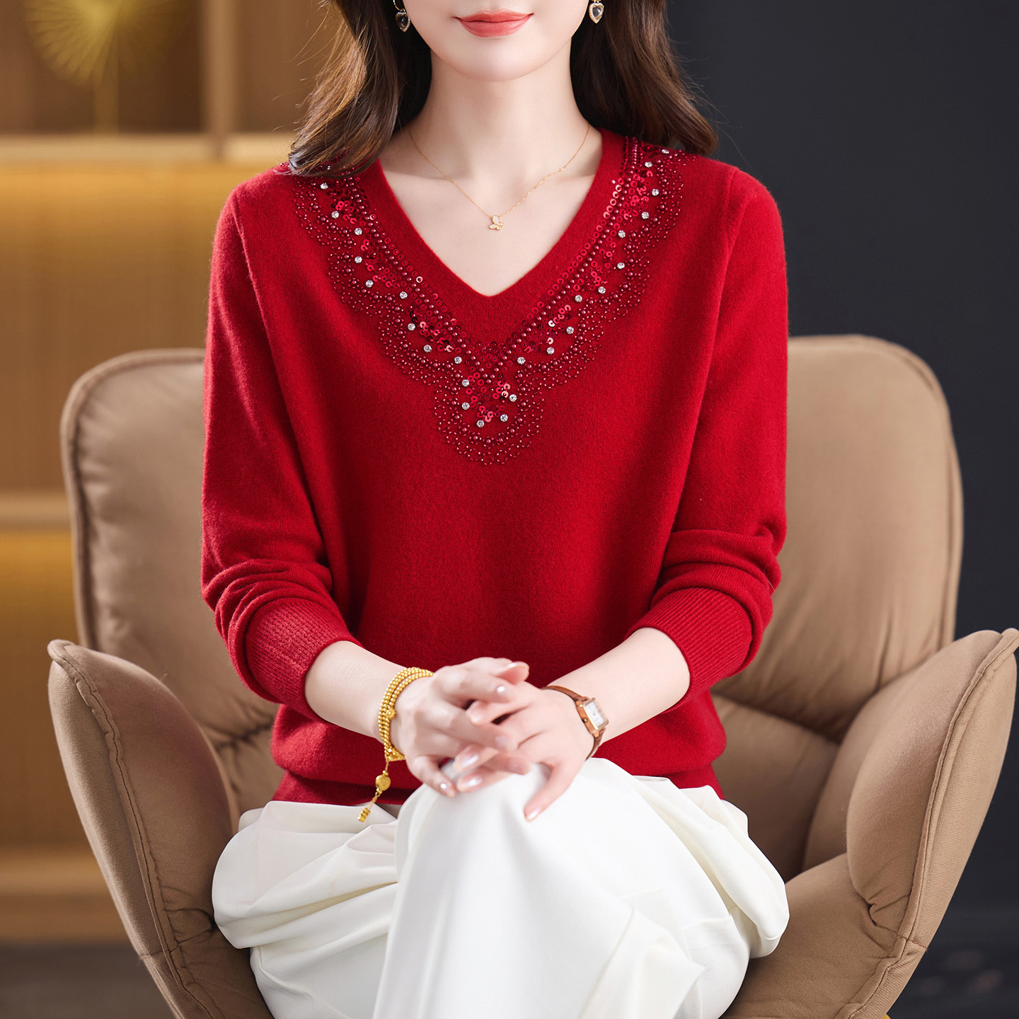 高端品质100%纯羊毛衫女V领毛衣秋冬宽松重工钉珠镶钻内搭打底衫
