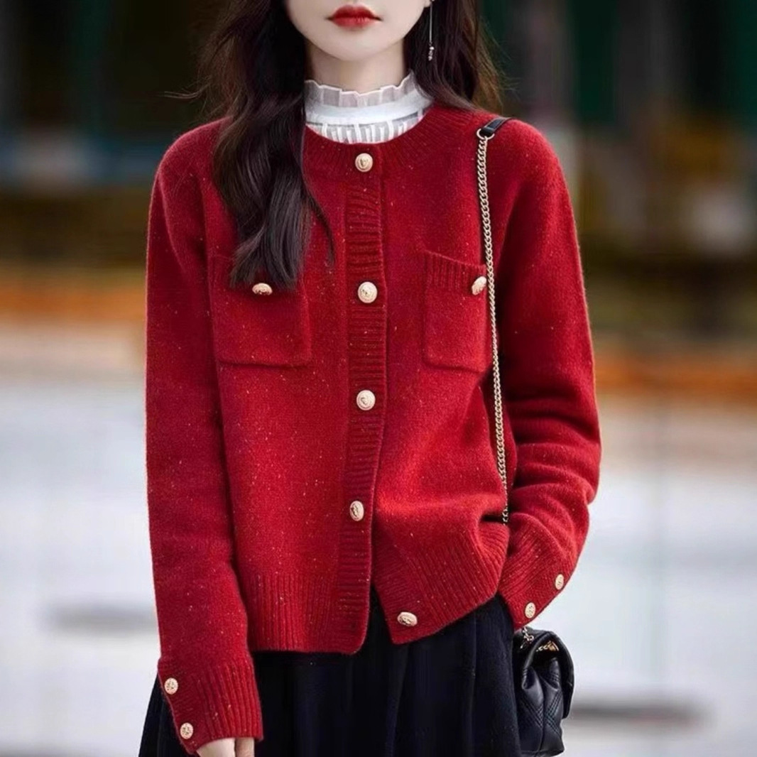 オルドスカシミアカーディガンレディースラウンドネック小香風春秋新作レッド干支年ニットウールジャケット