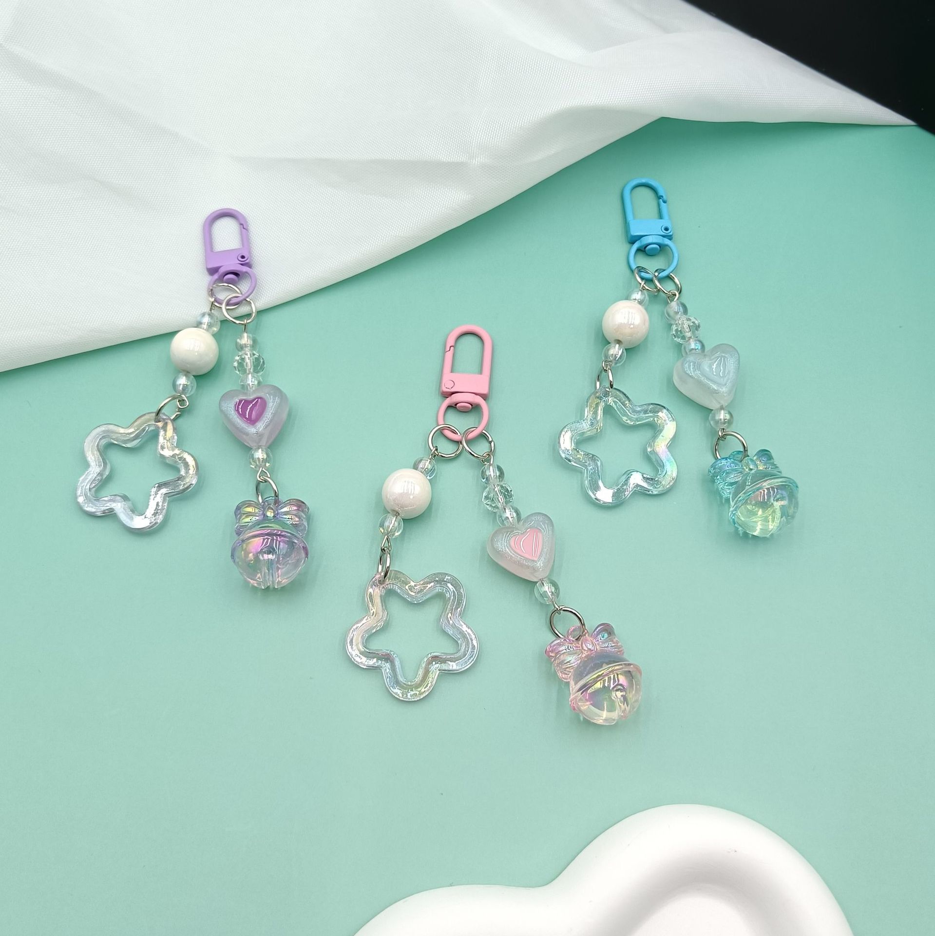 糖果色镀彩串珠钥匙扣蝴蝶结创意小清新爱心钥匙链包包小挂件货源
