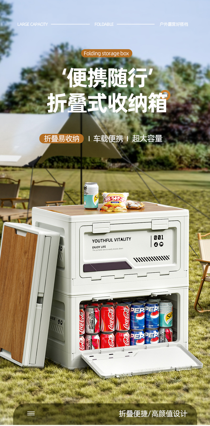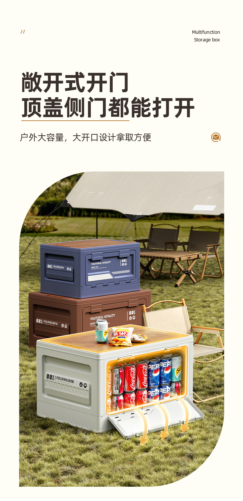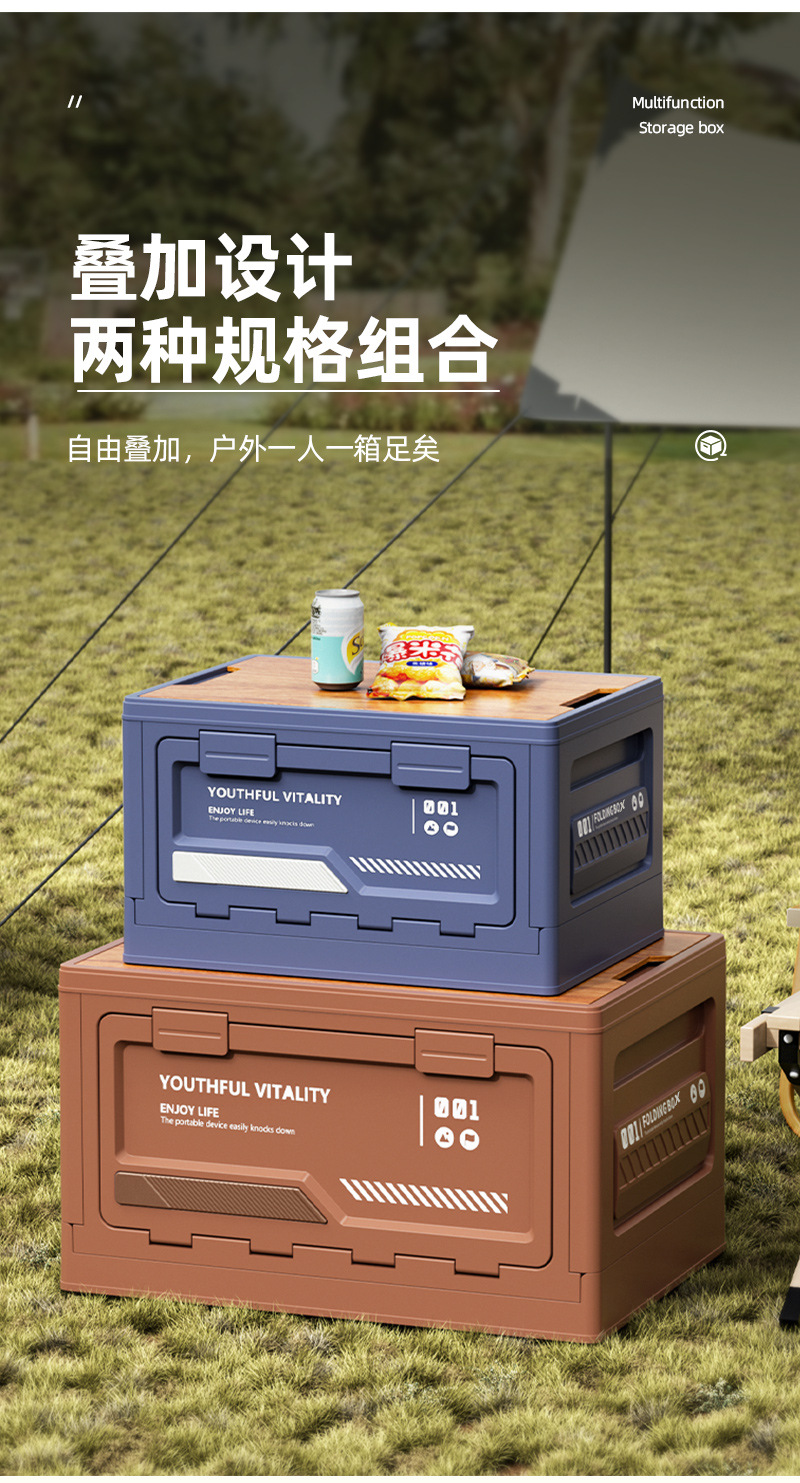 户外露营收纳箱侧开门野营折叠箱车载后备箱便携带木盖摆摊整理箱