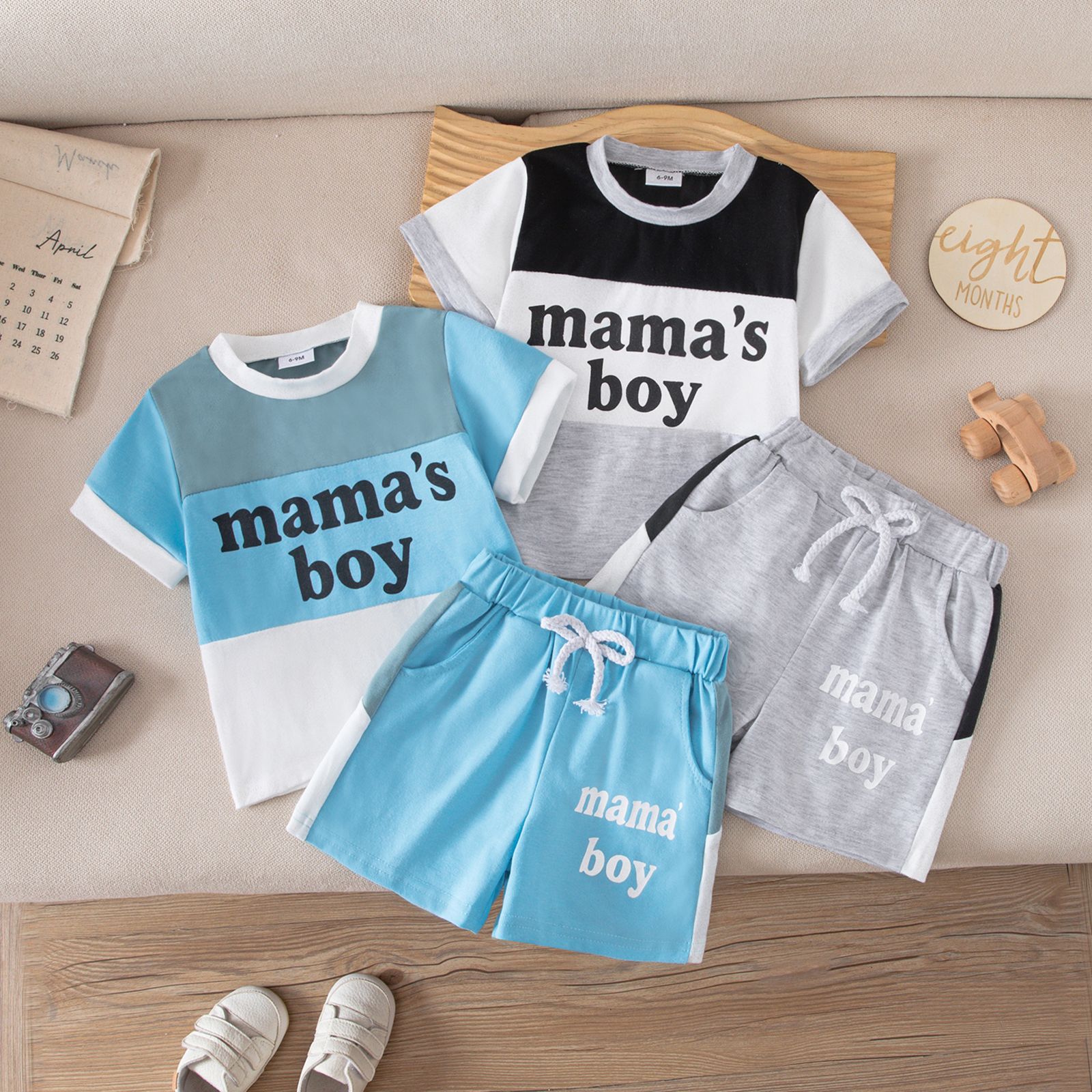 亚马逊新款2026年童装mama'sboy幼童夏季短袖男童拼接休闲两件套