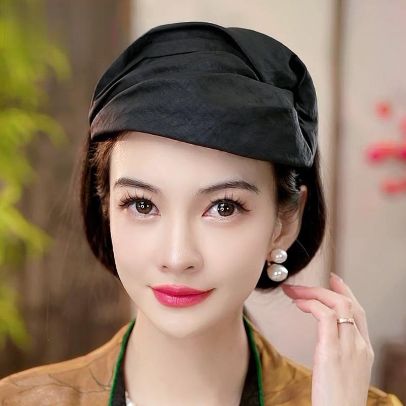 香雲紗さんの半帽子は白髪のシルクを隠しています。