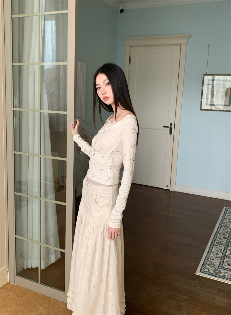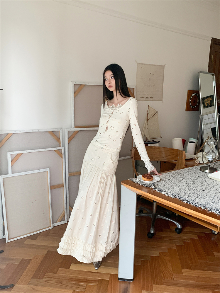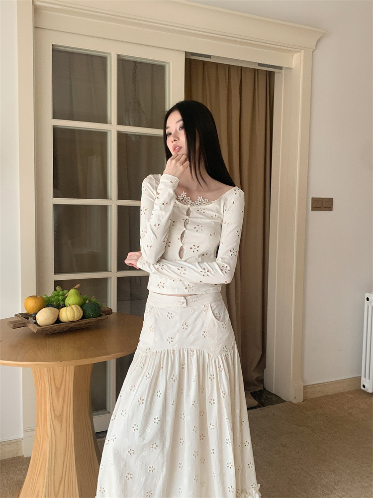 女性用ドレススーツ、ニッチなレースステッチ中空シャツトップ、耳付きスカート2点セット