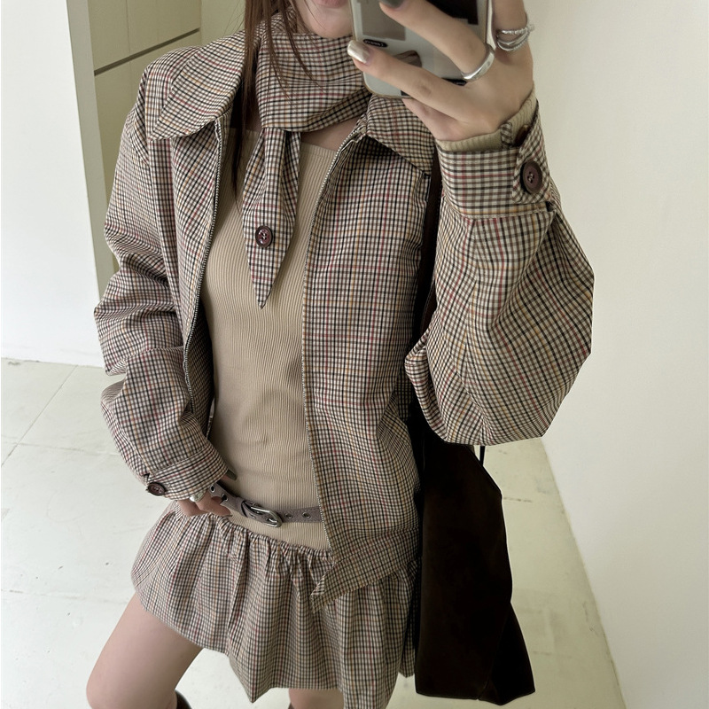 套装女休闲夹克上衣短外套米色拼接格纹一字领花苞裙连衣裙两件套