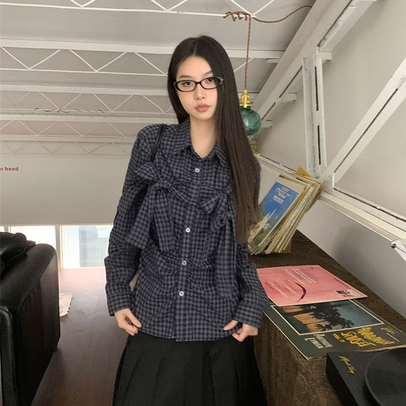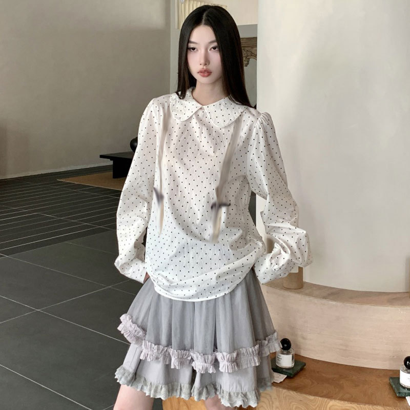 波点长袖娃娃领印花后门襟宽松衬衫女+双层花边短款半身裙纱裙秋