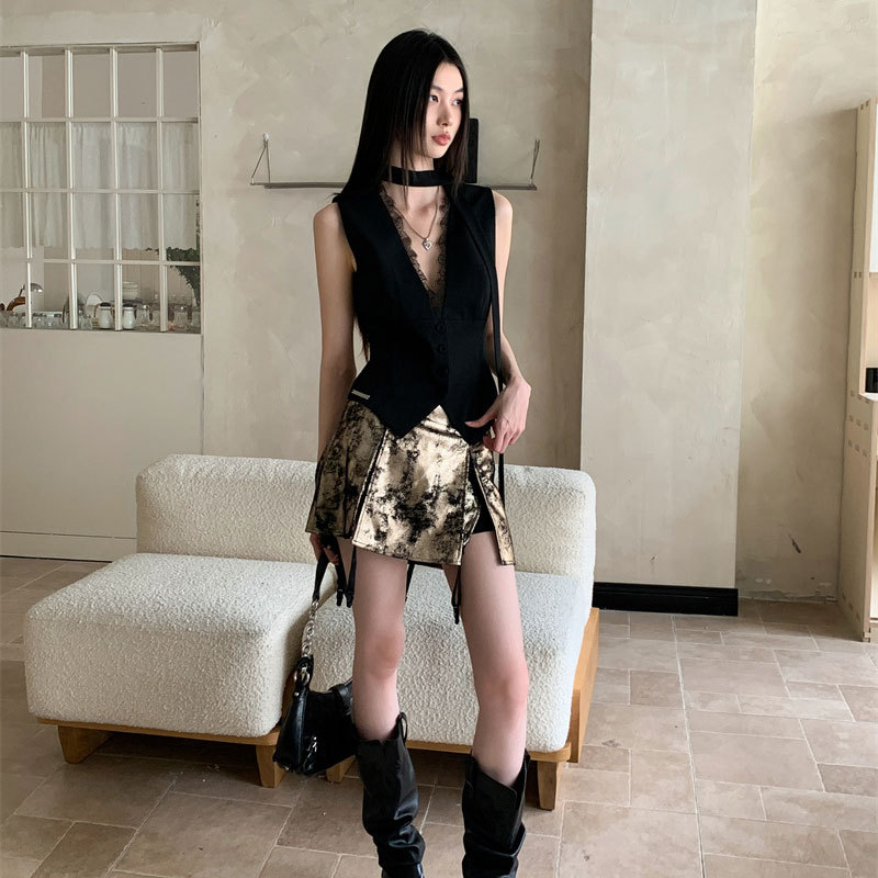 女性のデザイン感のあるレースのストラップのベストの上着の高腰の長いスカートのギャルの2つのセット
