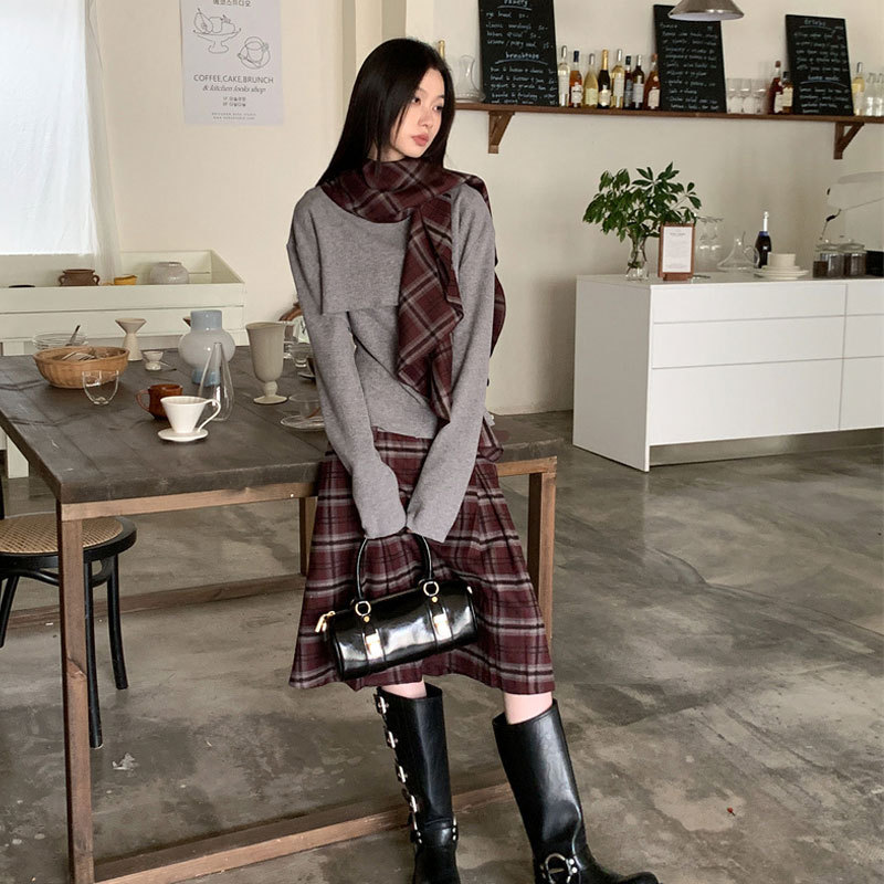 女性の灰色の山の襟の長袖のニットの上着 + 高腰の中の長いタイプの格子縞のa字の半身のスカートの2つのセットの春